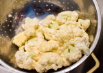 Skölj och skär bort bladfästet på blomkålen. Skär loss buketter och halvera dem.