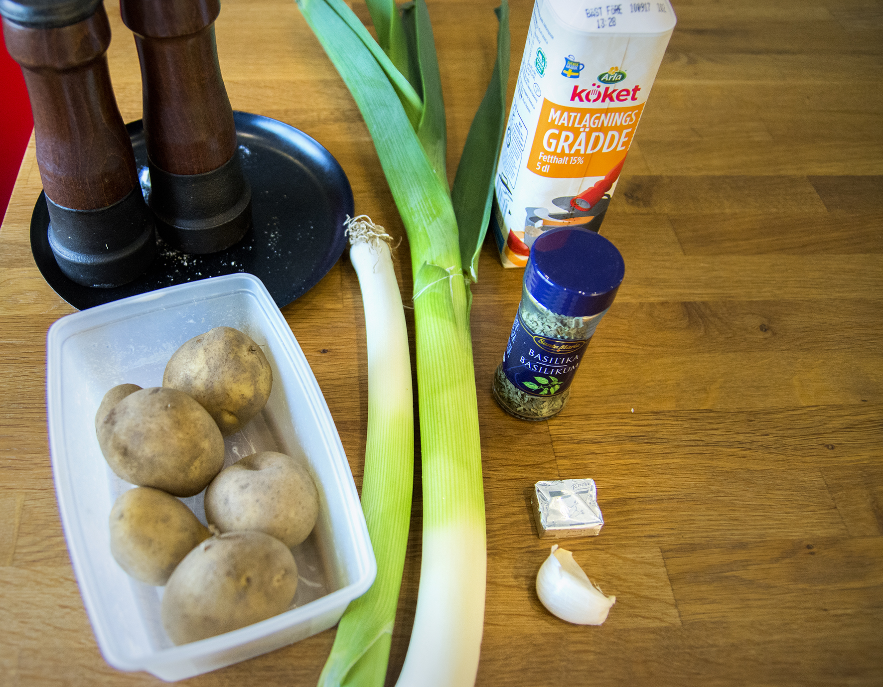 Skala potatis och ansa purjolök, skölj och skär i bitar. Finhacka vitlöken.
