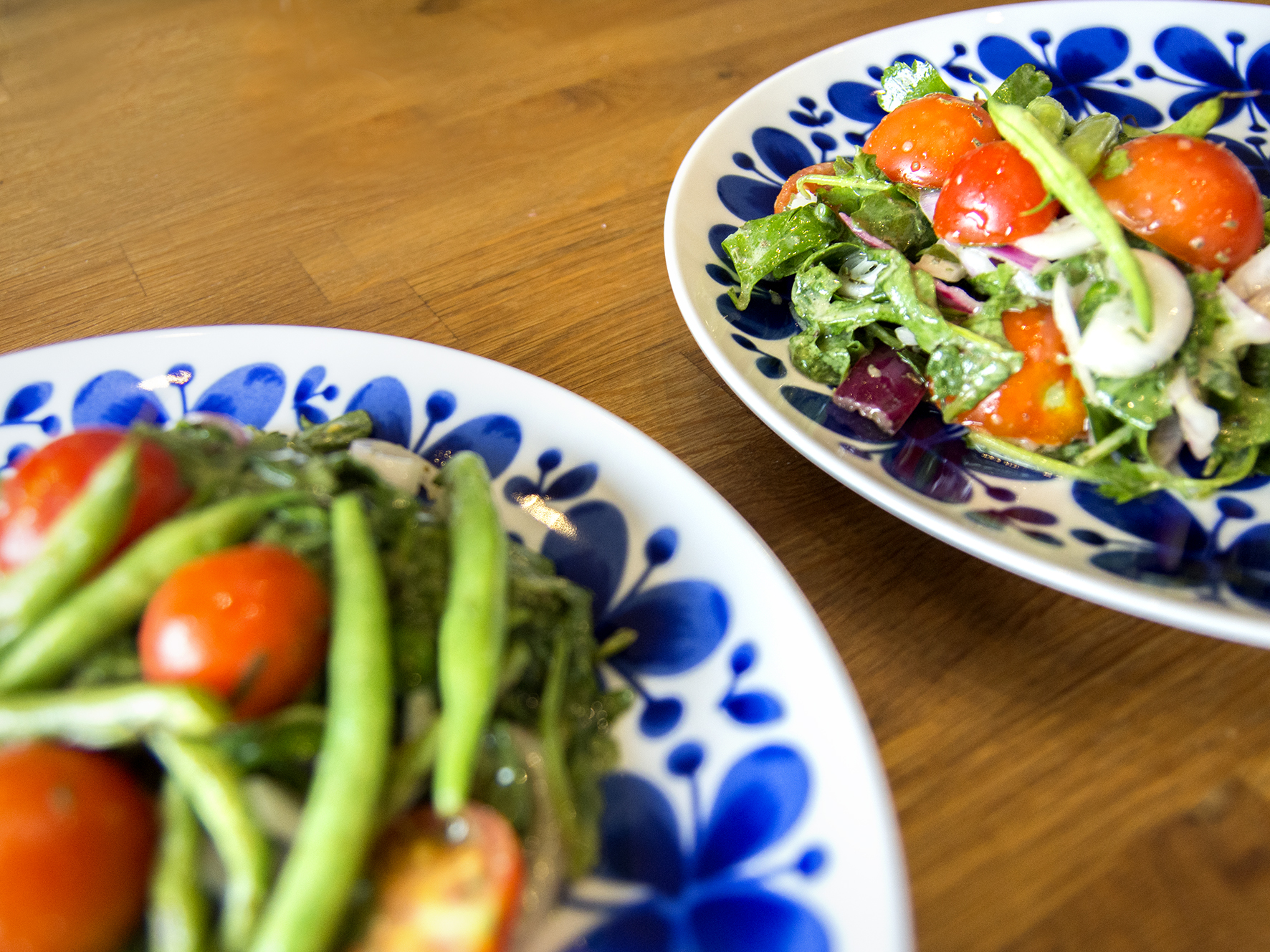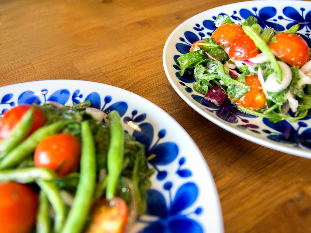 Skölj alla grönsaker. Ansa bönorna, dela tomaterna i två-fyra delar beroende på storlek. Skär rödlöken i tunna ringar.