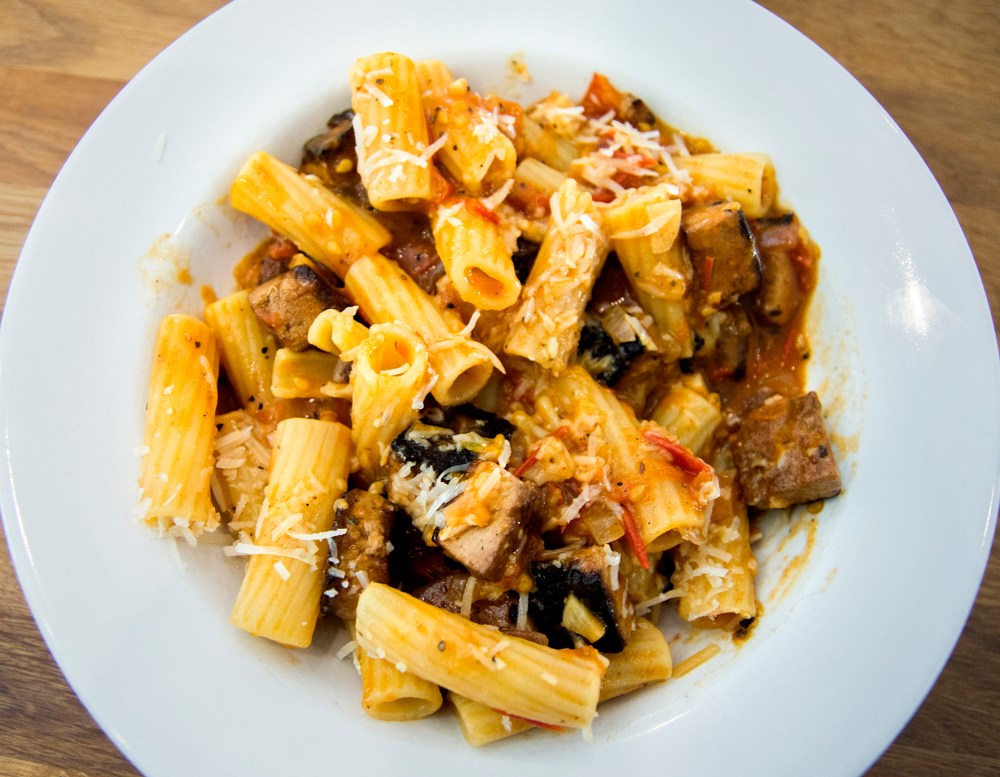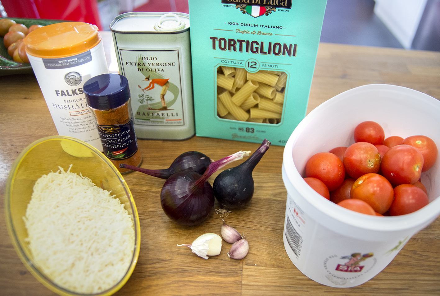 I april var jag på snabbvisit i Rom, som jag nämnt tidigare. Det jag inte skrev då var att jag verkligen fick upp smaken för en rätt som heter pasta Amatriciana. Åh, gud. Smaken! Men … det passade sig liksom inte att sjunga rättens lov här, det är ju pancetta, en form av bacon, som är just det som får det att bli så mustigt och gott. Eftersom jag ju inte är vegetarian men gärna äter vegetariskt så har jag fuskat här hemma och lagat till en variant som var nästan på pricken som i Italien.