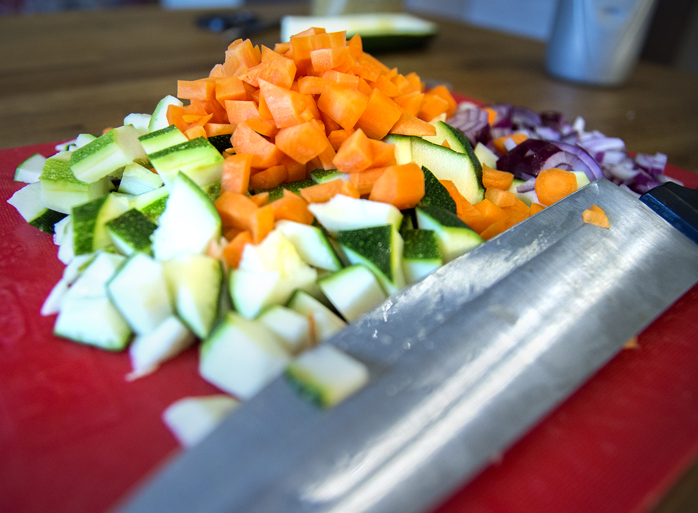 Skala vitlök, rödlök och morötter. Hacka löken, tärna moroten fint. Dela squashen på längden, kärna ur den med tesked och dela i små bitar.