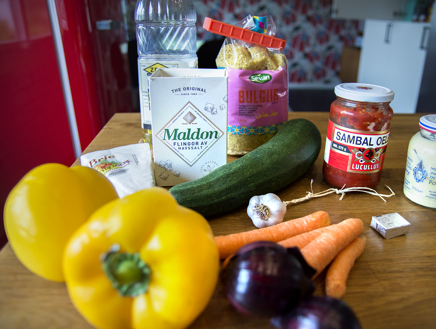 Fräs alla grönsaker i rapsoljan tills de mjuknat något men inte tagit färg. Blanda i bulgur och smaksätt med senap och sambal oelek.