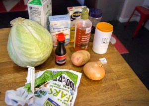 Hacka löken och stek tillsammans med vitkålen (i omgångar eftersom allt inte får plats samtidigt). Salta och peppra, lägg åt sidan.