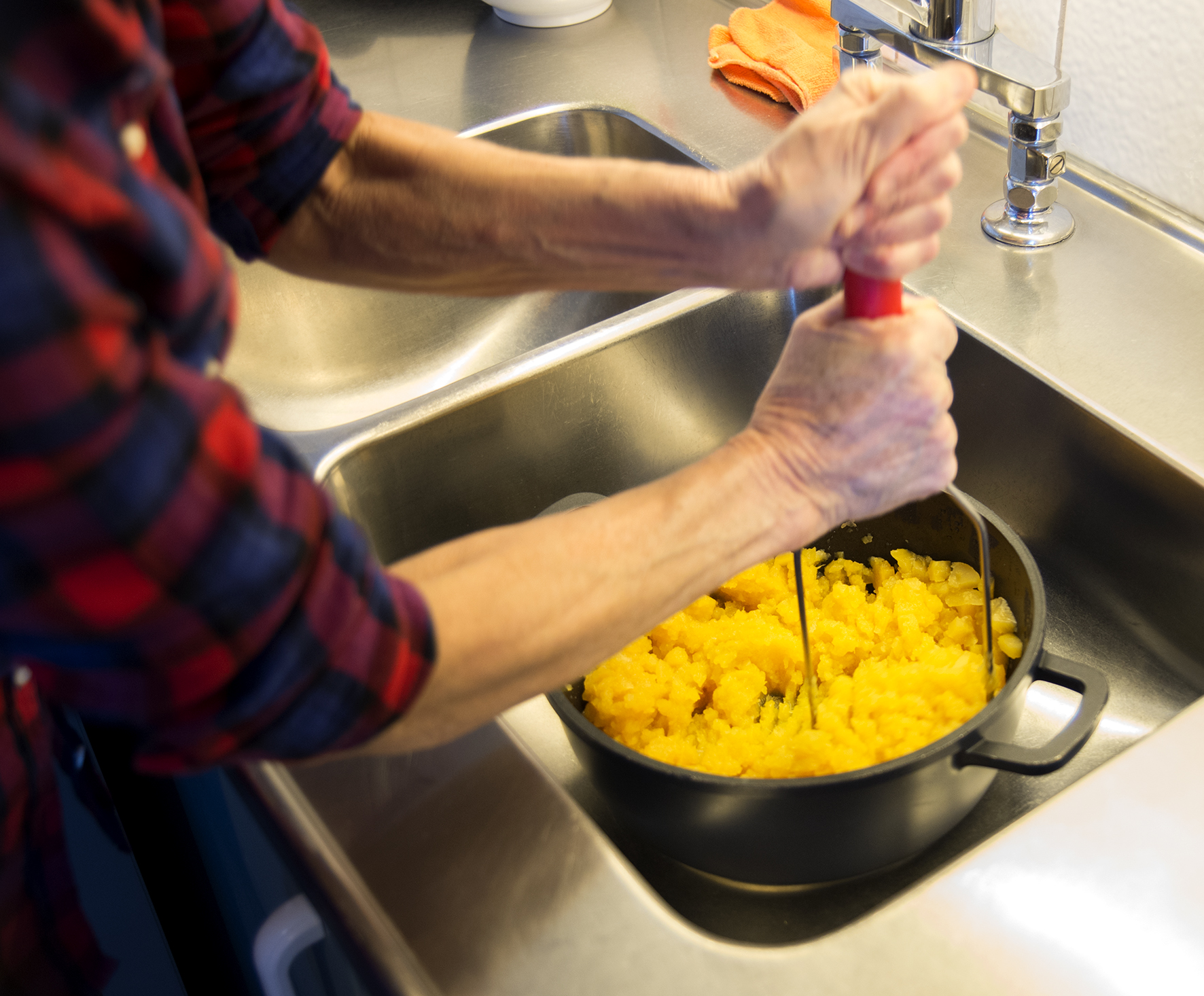 Skala kålroten och skär i mindre bitar. Koka dem mjuka i lättsaltat vatten, tar runt en timme men det beror på bitarnas storlek. Häll av kokvattnet och mosa kålroten med potatisstöt.