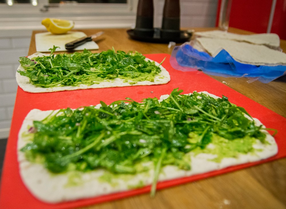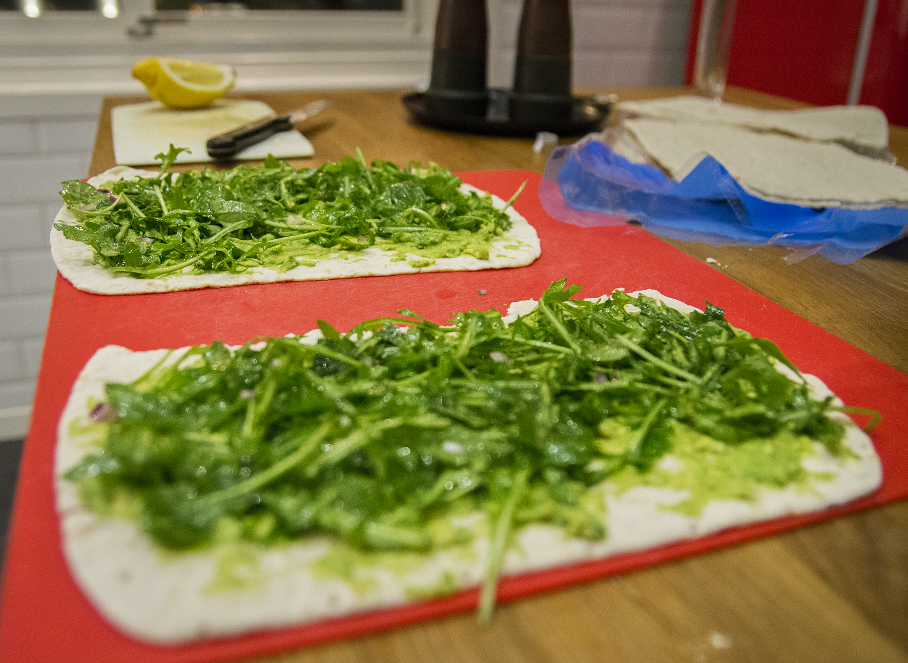 Bred avokadon i ett tunt lager på tunnbröden. Fördela ruccolasalladen över. Riv citronskal över och rulla ihop. Skär rullen i skivor, cirka 2-3 centimeter tjocka. Servera med ett glas bubbel.