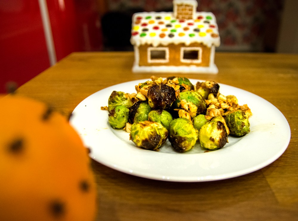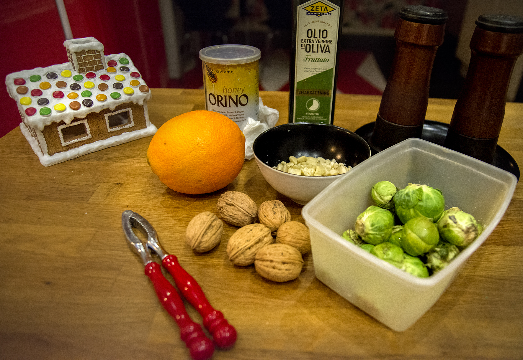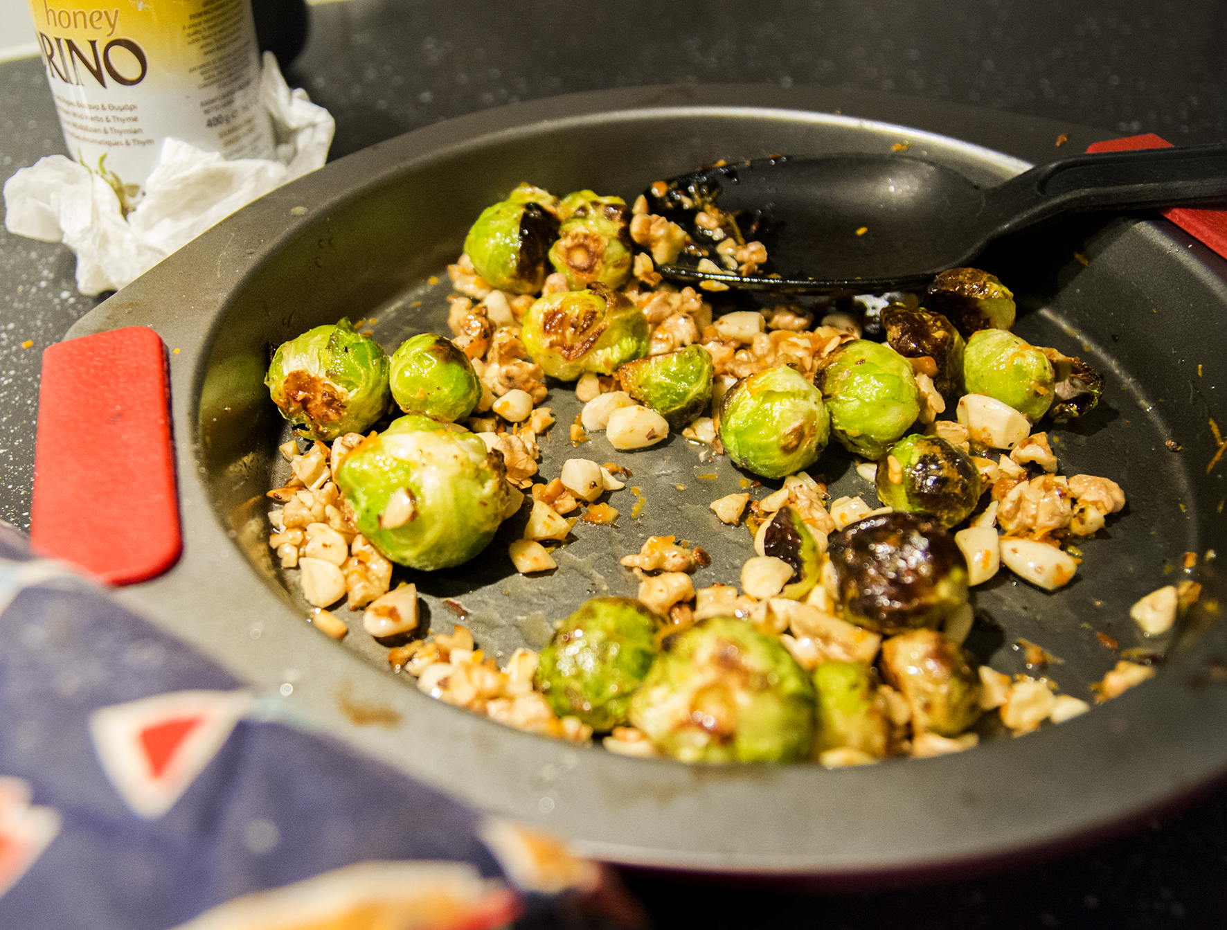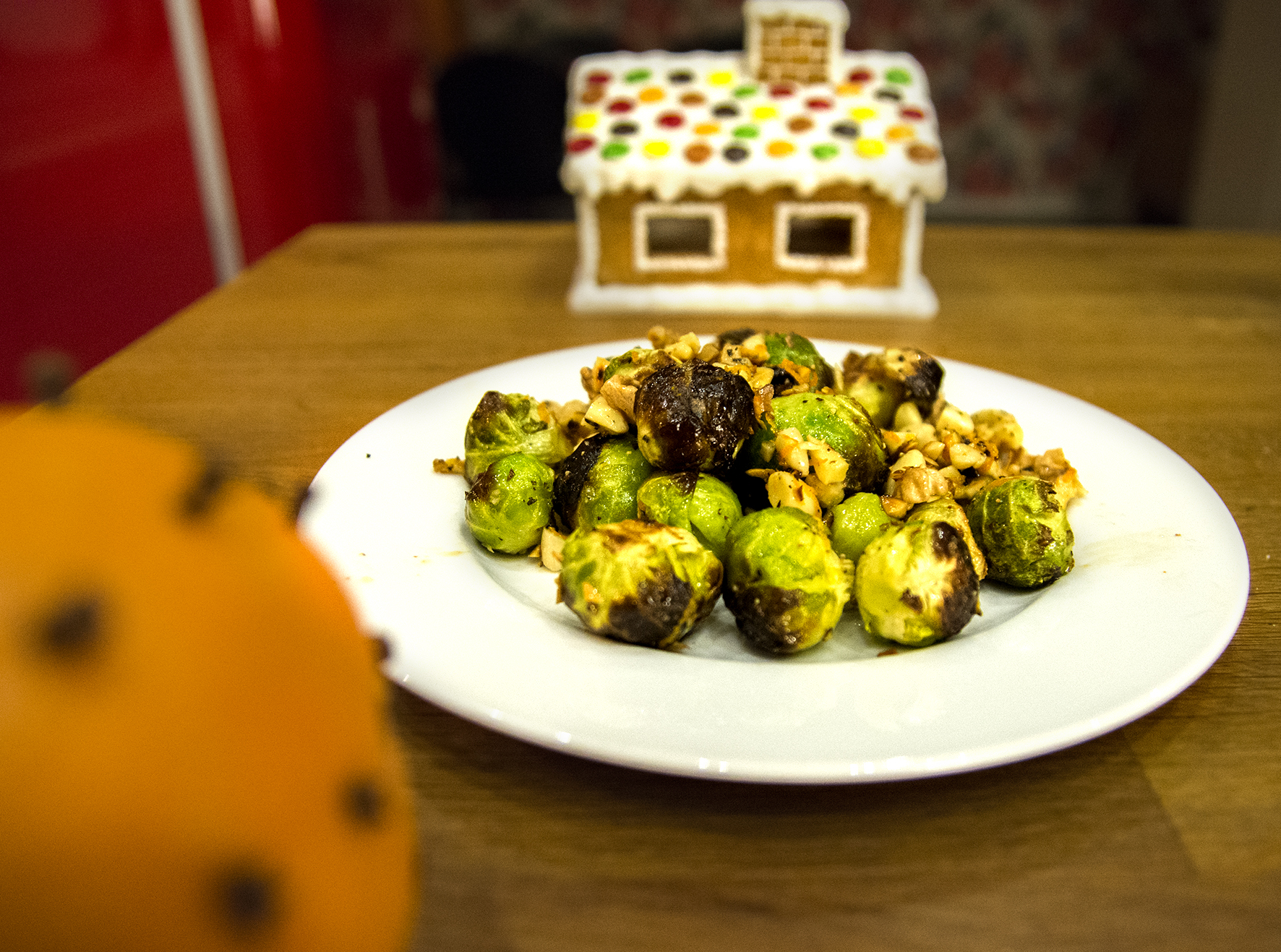 Jag skulle ju inte göra någon mer julrelaterad mat, men föll liksom lite på målsnöret. Det blev en av vinterns favoriter: brysselkål! Jag brukar bara äta den kokt (och det är ju inte så bara) men som ugnsbakad med olivolja på fick den verkligen ett krispigt lyft. Tillsammans med apelsin, salt och ett uns honung blev detta till en oväntad smakfest. Att nötterna gav ett härligt tuggmotstånd gjorde inte saken sämre. Mums!