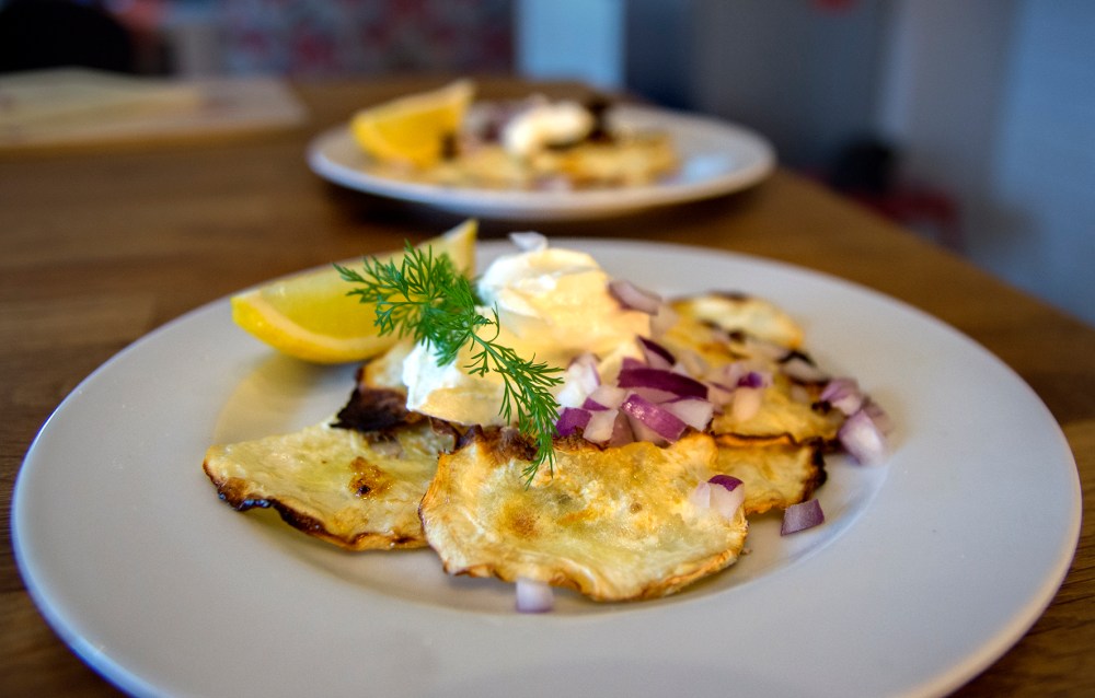 Fördela rotselleriskivorna på fyra tallrikar, skeda upp en klick crème fraiche och strö den hackade rödlöken runt. Garnera med dillvippor och servera med en klyfta citron.