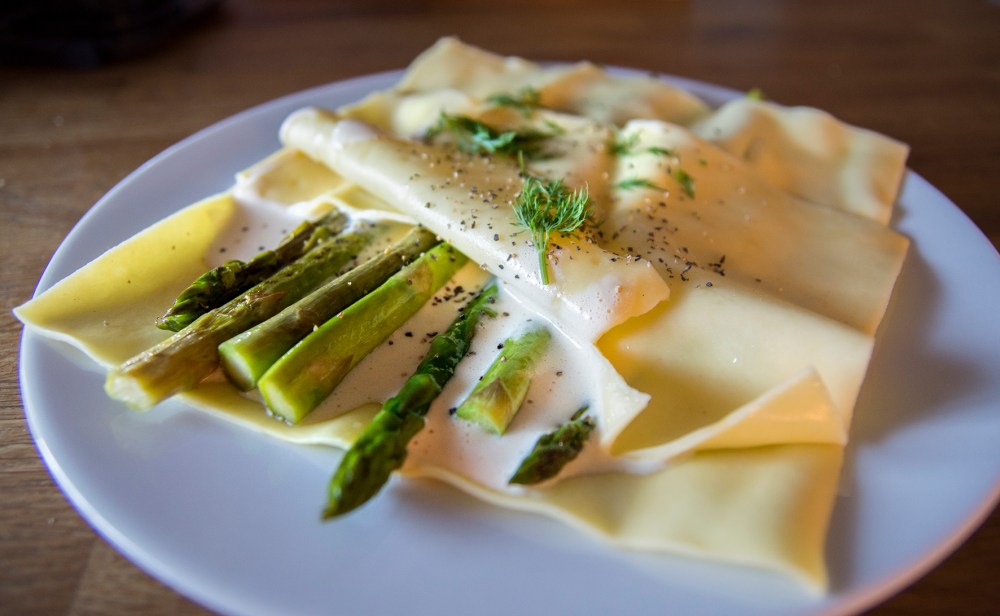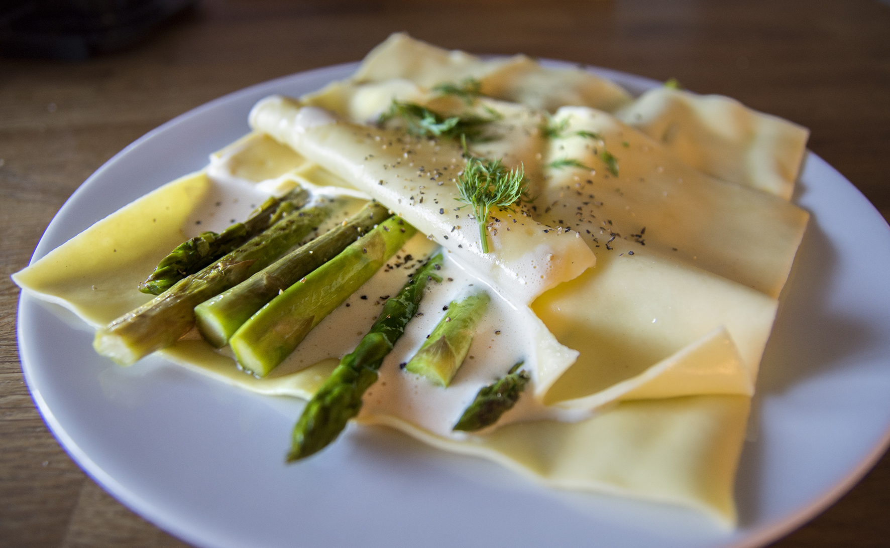 HUVUDRÄTT: Öppen lasagne med grillad sparris och hollandaise