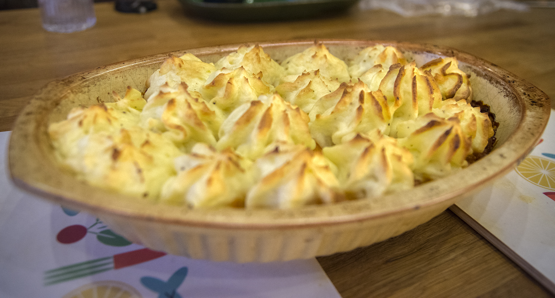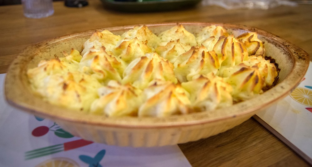 I min ungdom var jag au pair i London i nästan ett år och sedan dess har jag varit en inbiten anglofil. Musiken, människorna, klubbarna och pubarna … Jag minns mycket med värme, men däremot inte särskilt mycket av maten. Kokkonst är kanske inte det man mest förknippar med brittisk kultur. Jag tänkte att det kan funka som vardagsmat och snodde ihop en veggovariant av klassikern Shepherd’s pie. En slags ulv i fårakläder, för paj är det ju inte utan bara potatismos och färsröra med ett namn som osar engelsk landsbygd. Enjoy, mate!