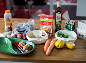 Gör salladen under tiden. Låt broccolin tina. Koka matvetet i vatten med buljongtärningen (se vattenmängd och koktid på förpackningen) och låt sedan svalna.