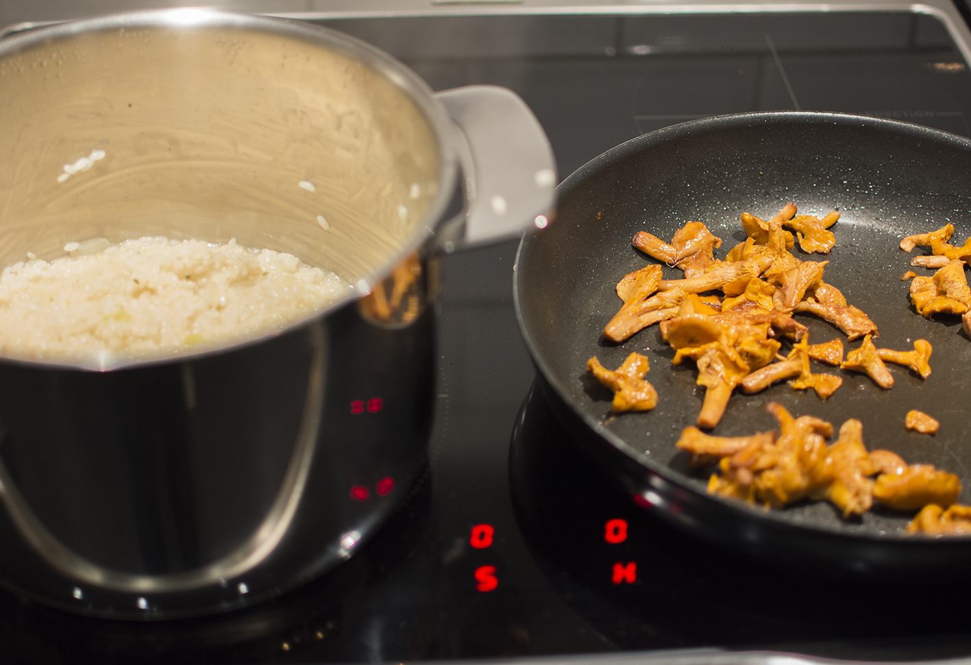 Stek kantarellerna och rör ner dem i riset. Tillsätt mer vätska om det behövs och låt riset koka klart.