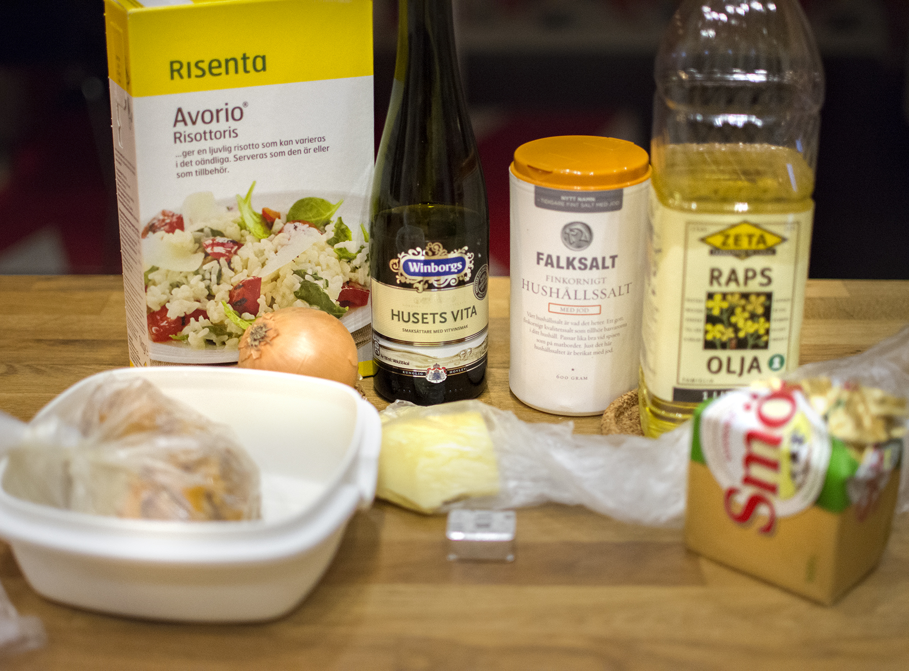 Skölj riset. Skala och finhacka löken. Fräs lök och ris i olja i en kastrull med tjock botten. Tillsätt vinet och låt småkoka tills nästan all vätska har kokat in.