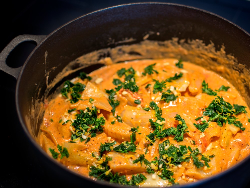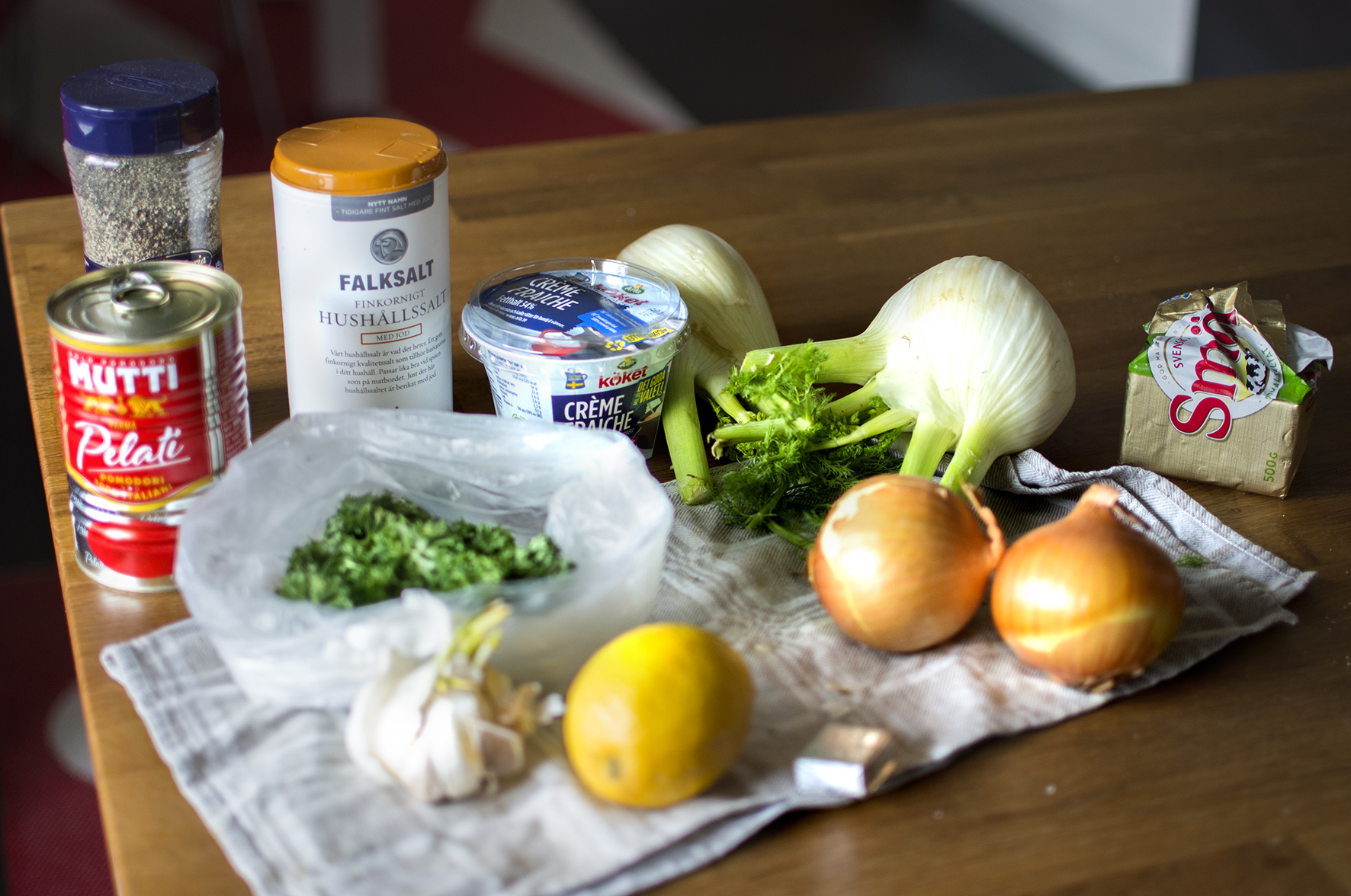 Skala och skär löken i rejäla klyftor. Fräs löken i smör i en stor gryta. Lägg i fänkålen och häll på tomaterna med spad samt crème fraiche och buljongtärningen. Salta och peppra. Låt koka på svag värme under lock 10-15 min. Rör om då och då.