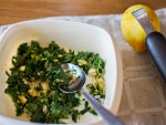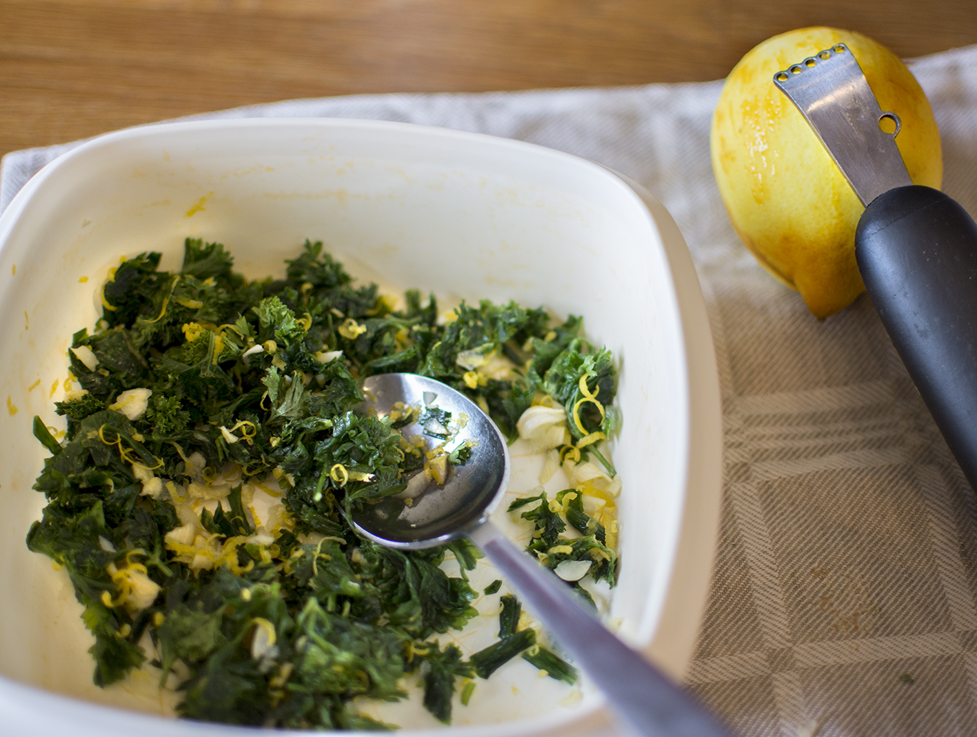 Gör gremolatan. Finhacka vitlöken och blanda med persiljan. Riv i citronskalet och blanda om.