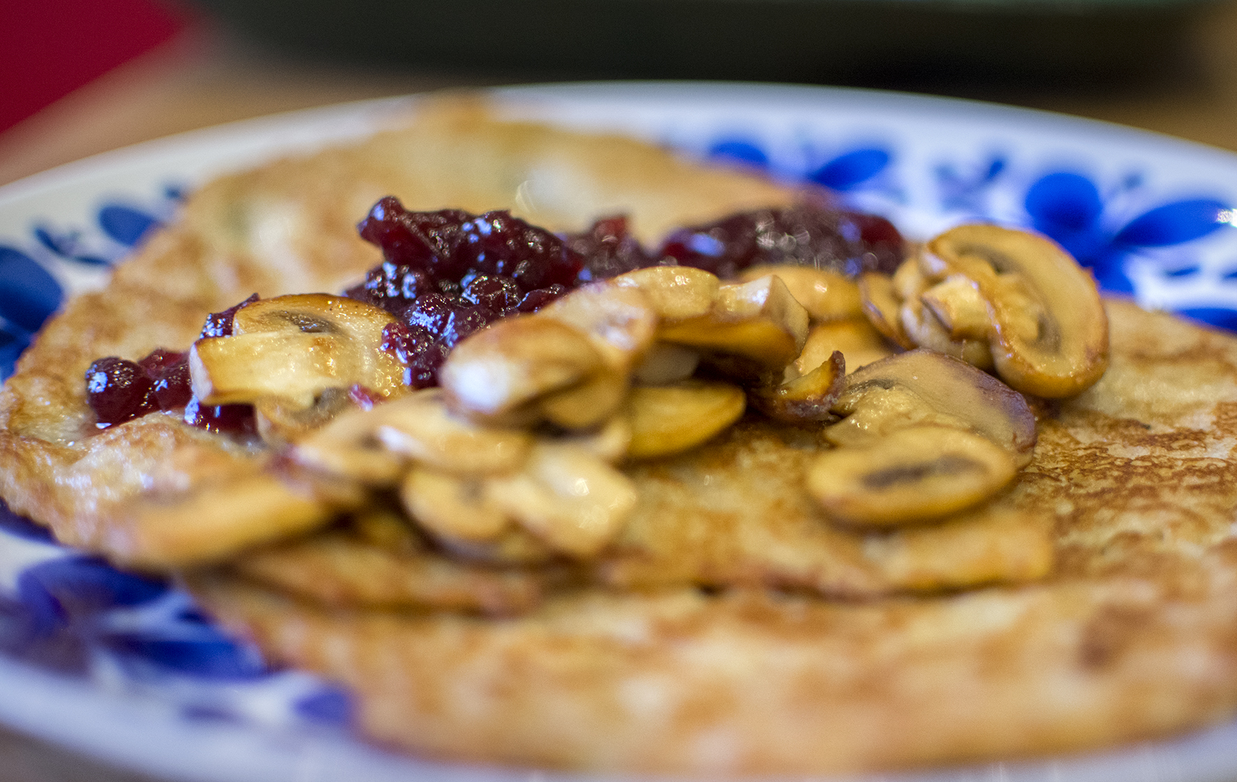 Lägg upp raggmunkarna på en tallrik och fördela svampen över. Servera med lingonsylt.