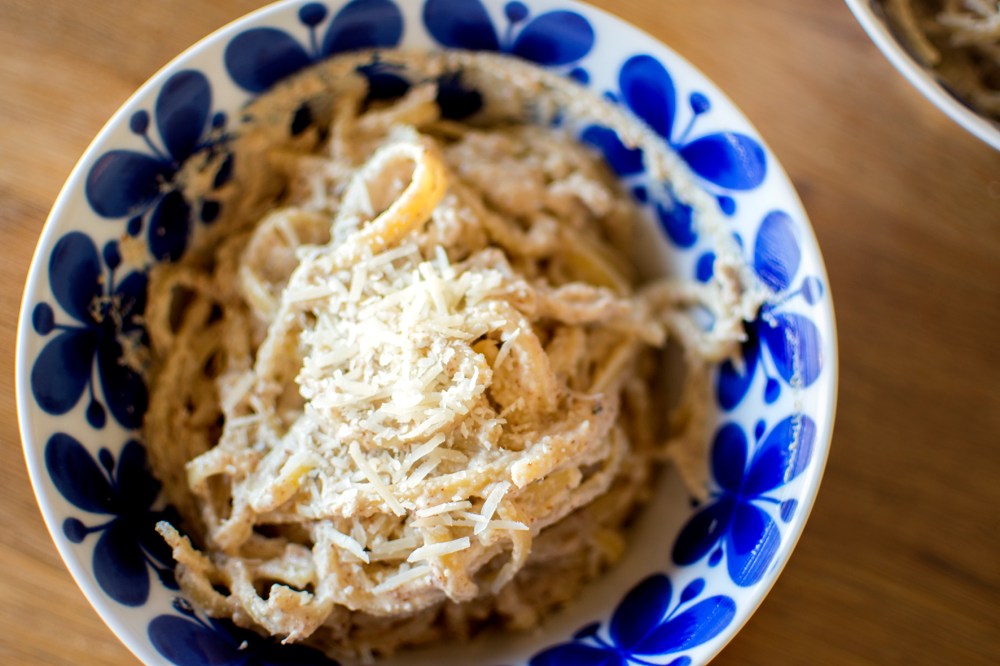 Jag fyllde år häromveckan och bjöd in min mor till en födelsedagslunch, i stället för bara det där tjatiga tårtfikat (som vi tog efter så klart). Ville testa ett nytt vegorecept samtidigt och valde detta från Vegomagasinet (originalrecept här), lockad framför allt av att det skulle vara så himla lätt och snabbt samtidigt som det enligt tidningen skulle vara en rätt med lyxkänsla. Och även om den var helt okej, kände jag redan vid första tuggan att något saknades. Jag kommer att göra om den, men i en uppgraderad variant. Håll ögonen öppna för nötpasta 2.0!