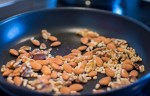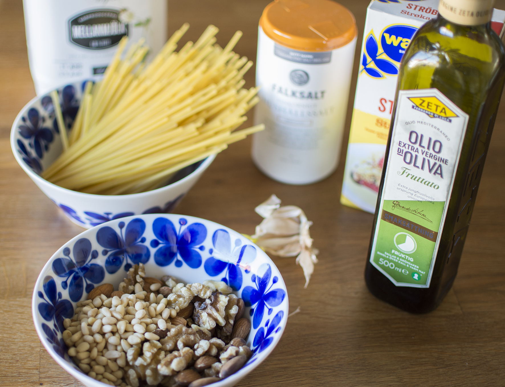 Rosta valnötter, mandel och pinjenötter i en torr stekpanna tills de fått en gyllene ton. Mixa fint med ströbröd, olivolja, vitlök och salt.