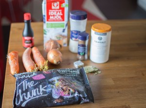 Skala morot och lök, skär moroten i grova slantar och strimla löken.