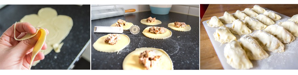 Kavla ut hälften av degen så tunt du kan. Stansa ut rundlar, cirka 10 centimeter i diameter. Lägg en tesked fyllning i mitten, ta lite vatten på ett finger och stryk längs kanten på rundeln, vik dubbel och tryck till lätt så att delarna klibbar ihop. Lägg åt sidan och låt torka. Upprepa proceduren med resten av degen. Kavla sedan ut nästa deghalva och repetera.