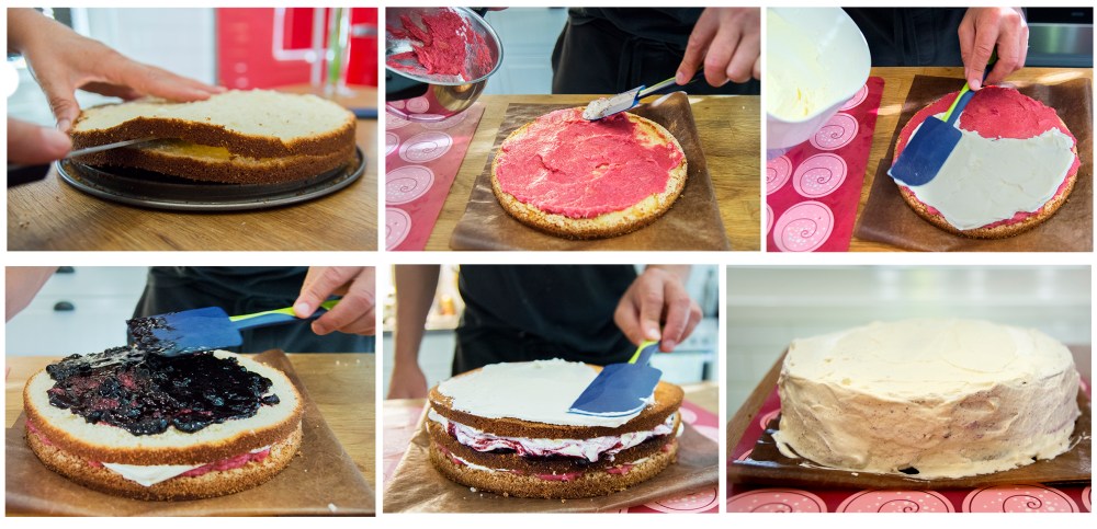 Bred på rabarberkompott på en botten och täck sedan med vaniljvisp. Lägg på nästa botten. Täck den med blåbärssylt och sedan vaniljvisp. Lägg på sista botten.