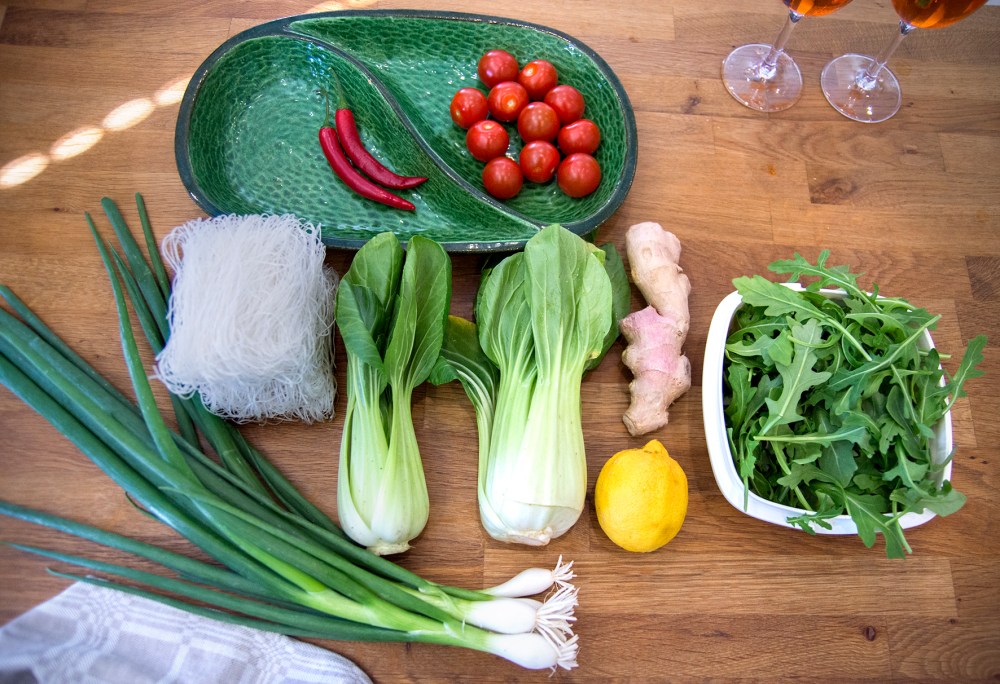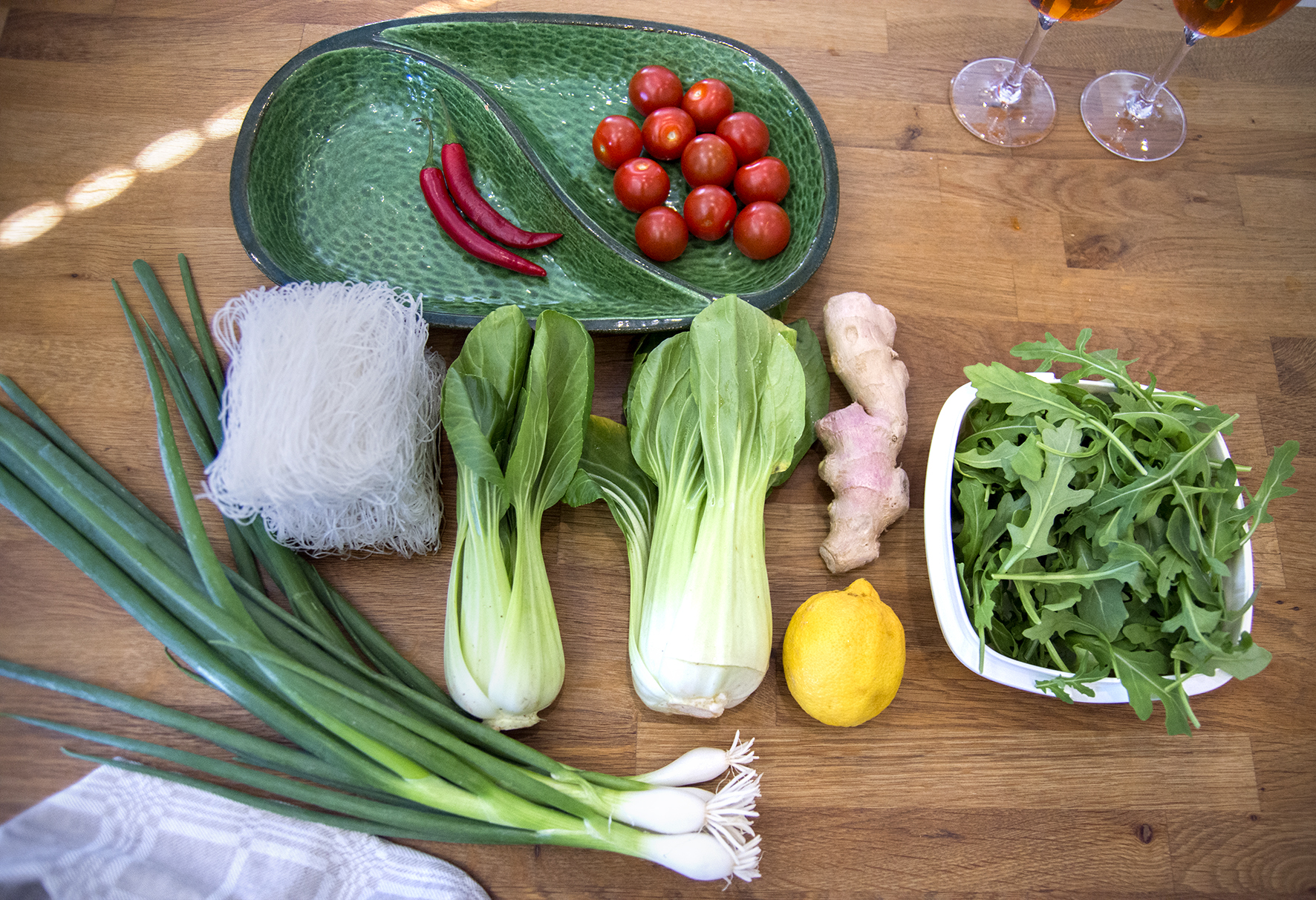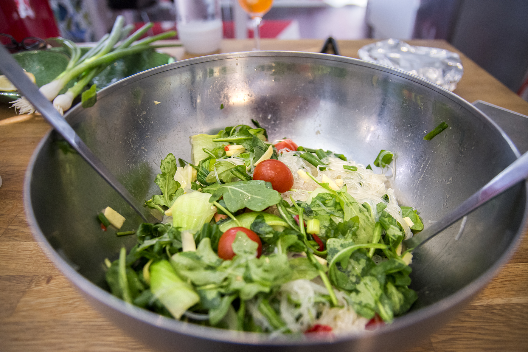 Blanda pak choi och glasnudlar med resten av grönsakerna i salladsskålen. Rör om ordentligt. Smaka av med citronskal, mer citronsaft, salt och peppar.