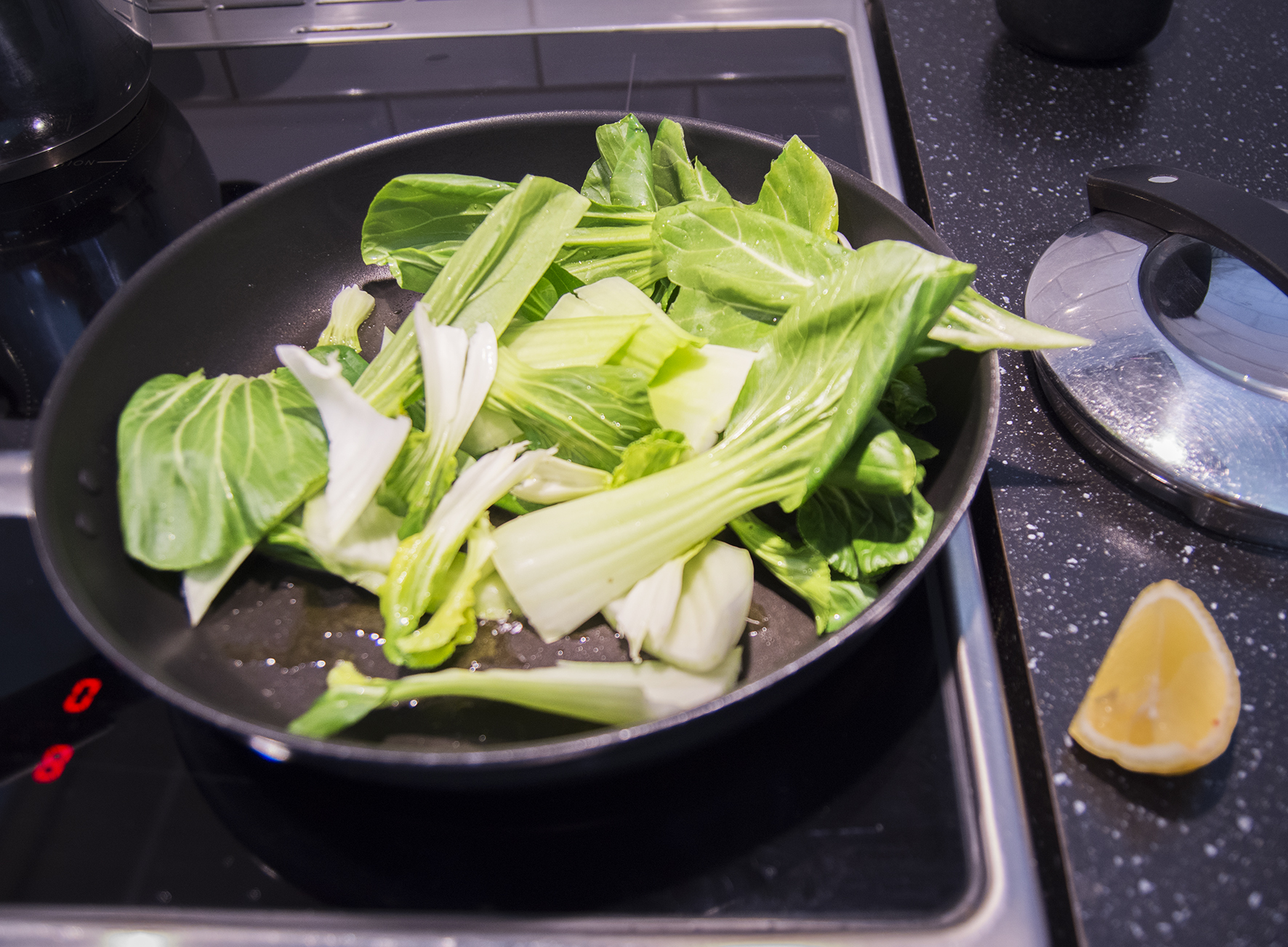 Skär de större pak choi-bladen i lite mindre bitar och behåll de små intakta. Stek dem i några minuter i olja, pressa över citron.