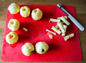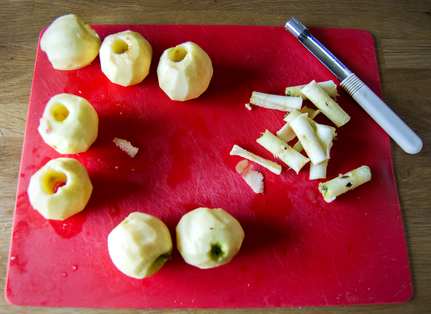 Skölj och skala äpplena, ta bort insektsangripna och skadade partier samt kärnhuset. Skär i mindre bitar.