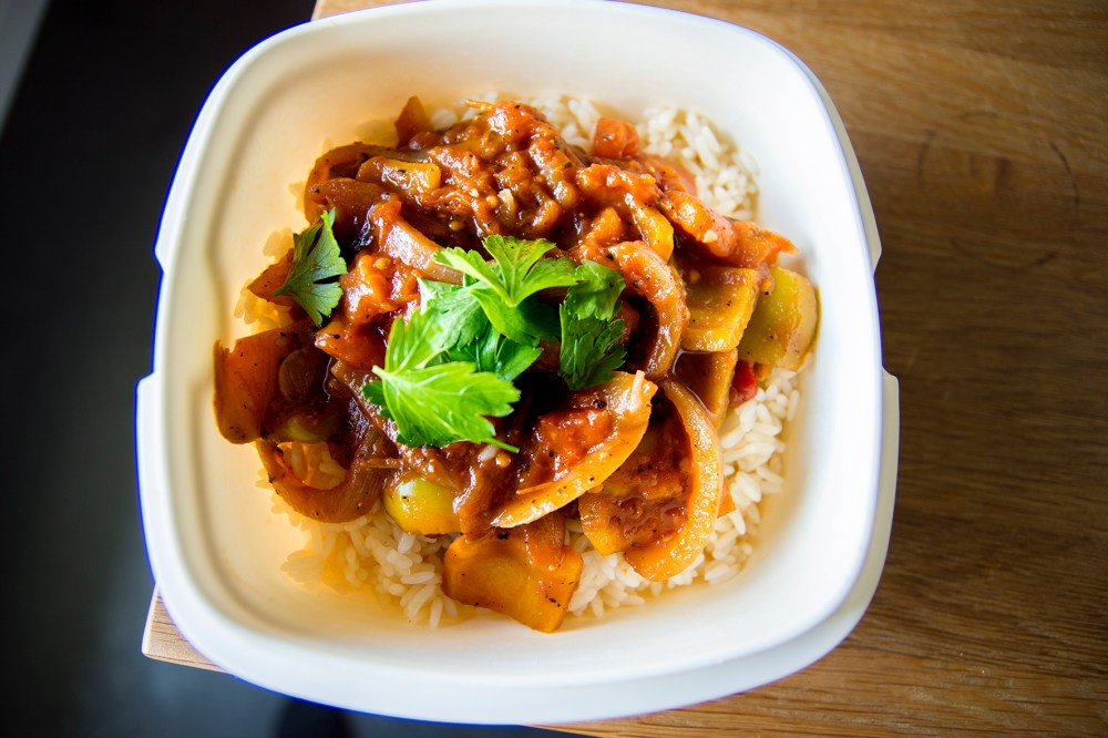 Servera grytan med ris och strö över persiljeblad.