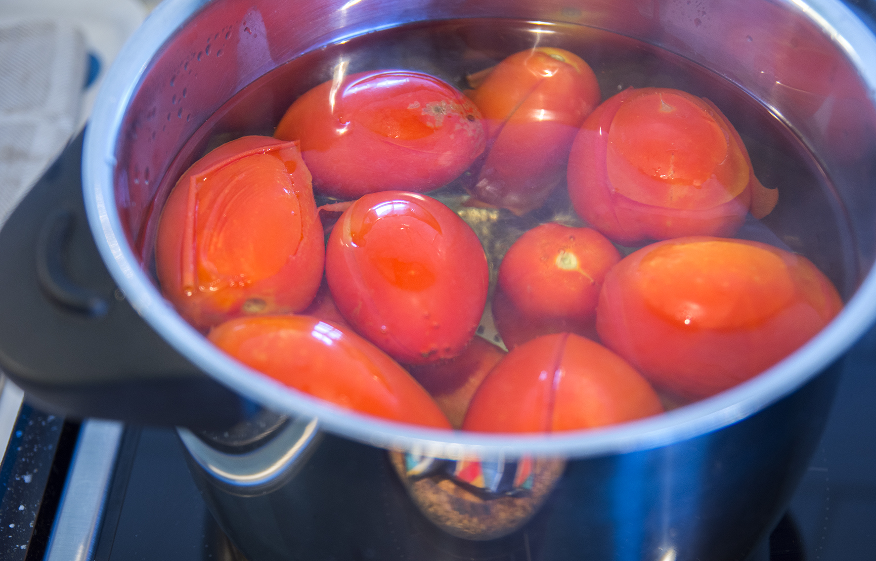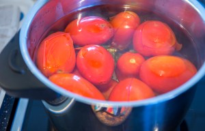 Skålla tomaterna. Börja med att skölja och skära en skåra i varje. Koka upp vatten och låt tomaterna koka knappt en minut. Häll dem i ett durkslag och skölj med iskallt vatten. Dra av skalet och tärna tomaterna grovt. Häll i paprikablandningen och låt puttra 10–15 minuter. Tillsätt lite vatten om du vill ha en tunnare konsistens.