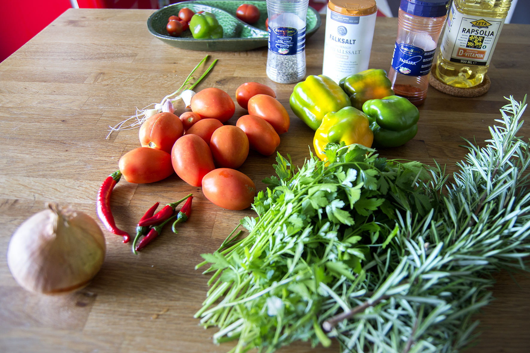 Skölj paprikan och rensa bort kärnor och hinnor från insidan. Skär i grova bitar. Skölj och finhacka chilin. Ta bort fröna om du vill ha en lite mildare smak.
