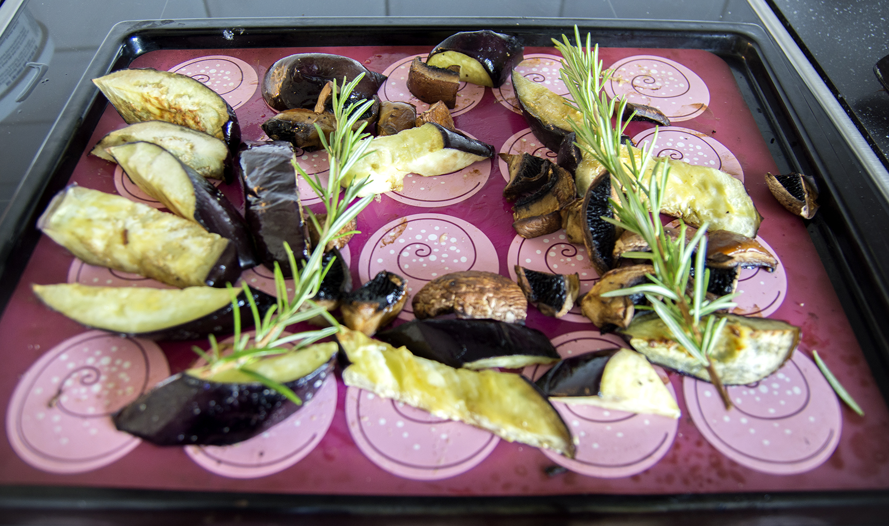Värm ugnen till 225 grader. Skölj och skär auberginen i grova tärningar. Putsa och skär svampen i något mindre bitar. Lägg på en plåt, ringla över olivolja och salta lätt. Baka i ugnen i cirka 10 minuter. Ta ut plåten, rör om bland grönsakerna, lägg på de två rosmarinkvistarna och baka i ytterligare cirka 10 minuter, tills grönsakerna fått fin färg.