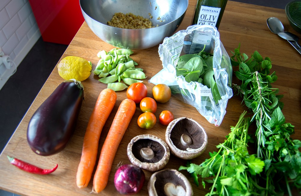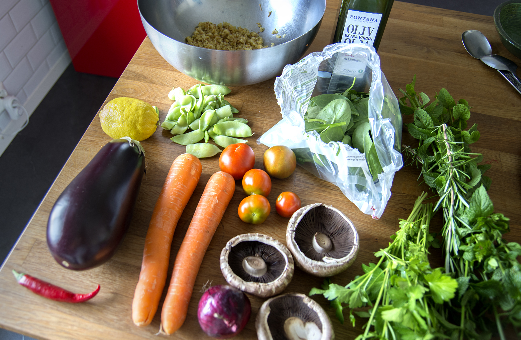 Koka bulgur i vatten med en buljongtärning och lite olivolja, cirka 10 minuter eller enligt förpackningens anvisning. Låt ljumna.