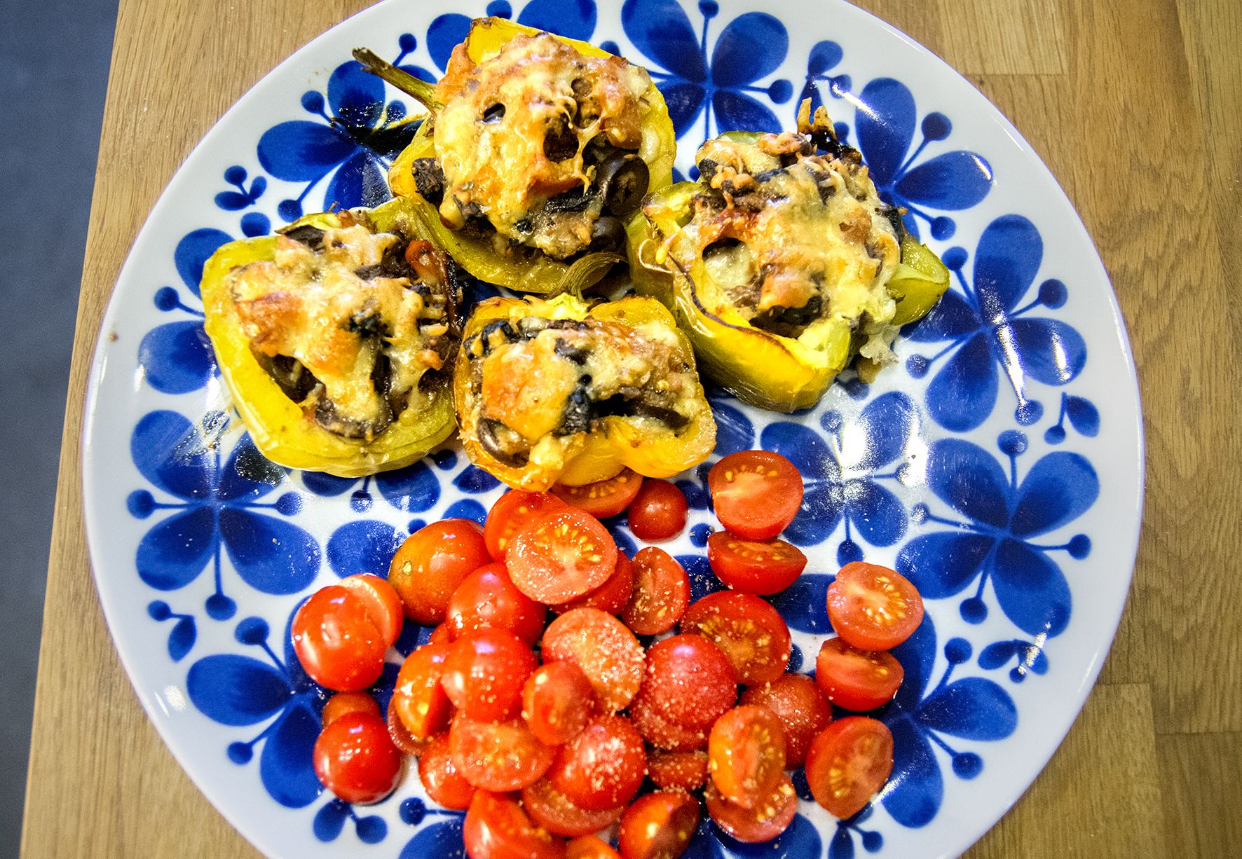 Fylld paprika går att variera i all oändlighet och av de tre recept jag publicerat tidigare (Fylld paprika, Fylld paprika med brie och Vegofärsfylld paprika med ajvarsås) har jag dragit slutsatsen att rätterna har två saker gemensamt: de smakar förträffligt men gör sig inte så bra på bild.