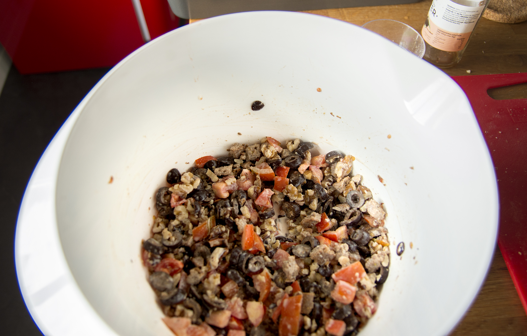 Blanda ner tomater, spansk peppar, valnötter och oliver med det uppblötta brödet. Salta och peppra. Riv i citronskalet. Blanda ned fräst svamp och vitlök och rör om ordentligt.
