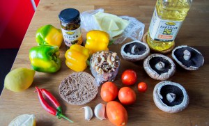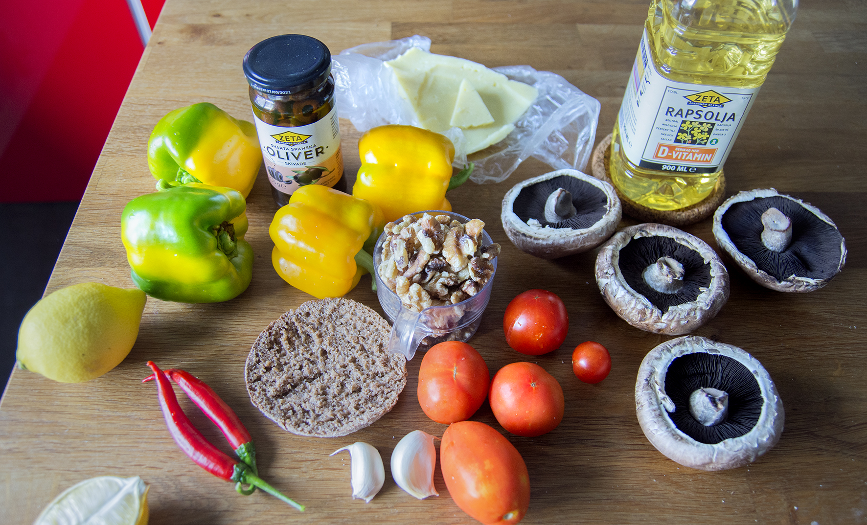 Putsa svampen och dela den i mindre bitar. Skölj och torka tomater, spansk peppar och paprika. Halvera paprikan och ta bort innanmätet men låt fästet vara kvar. Grovhacka tomaterna, finhacka pepparn. Skala och finhacka vitlöksklyftorna samt oliverna. Grovhacka valnötterna.