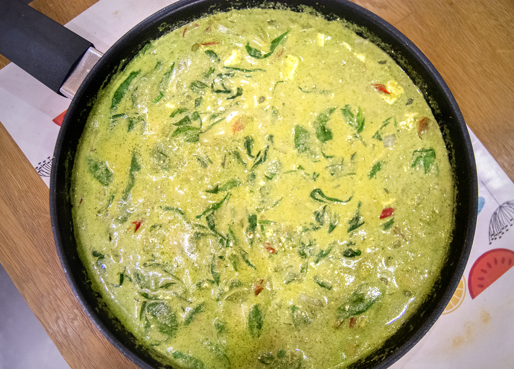 Mixa hälften av spenaten med en deciliter vatten. Tillsätt mixen och de resterande hela spenatblad i stekpannan. Pressa över saften av en lime och tillsätt kokosmjölken. Koka ihop i tre, fyra minuter. Smaka av med salt och mer lime om det behövs.