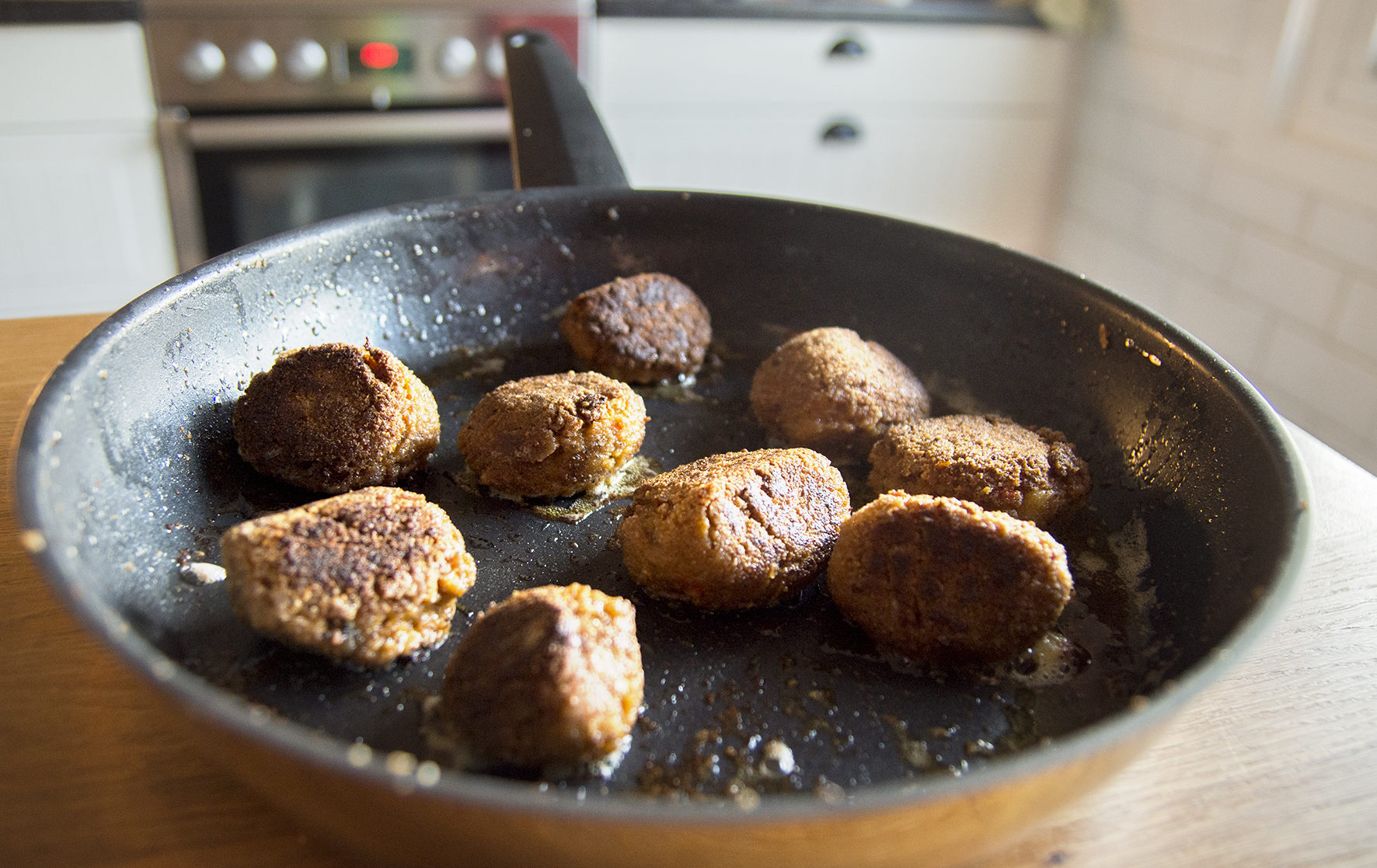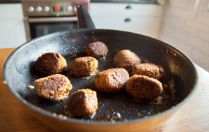 Stek vegofärsbullarna i omgångar i smör och olja tills de fått färg och konsistensen hårdnat. Det tar en stund …
