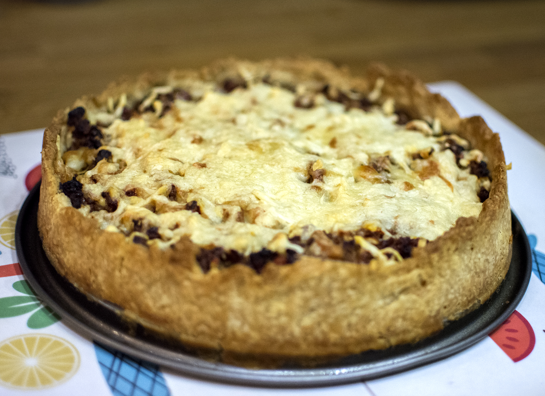 Börja med pajskalet. Blanda mjölsorterna, klicka i kallt smör och hacka ihop. Tillsätt det kalla vattnet och blanda snabbt ihop till en deg. Tryck ut den i en form och låt vila i kylen i 30 minuter.