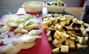 Skala och skär potatisen i centimeterstora tärningar. Skölj och skär aubergine och zucchini i cirka 2 centimeter stora tärningar. Skala och skär löken i skivor.