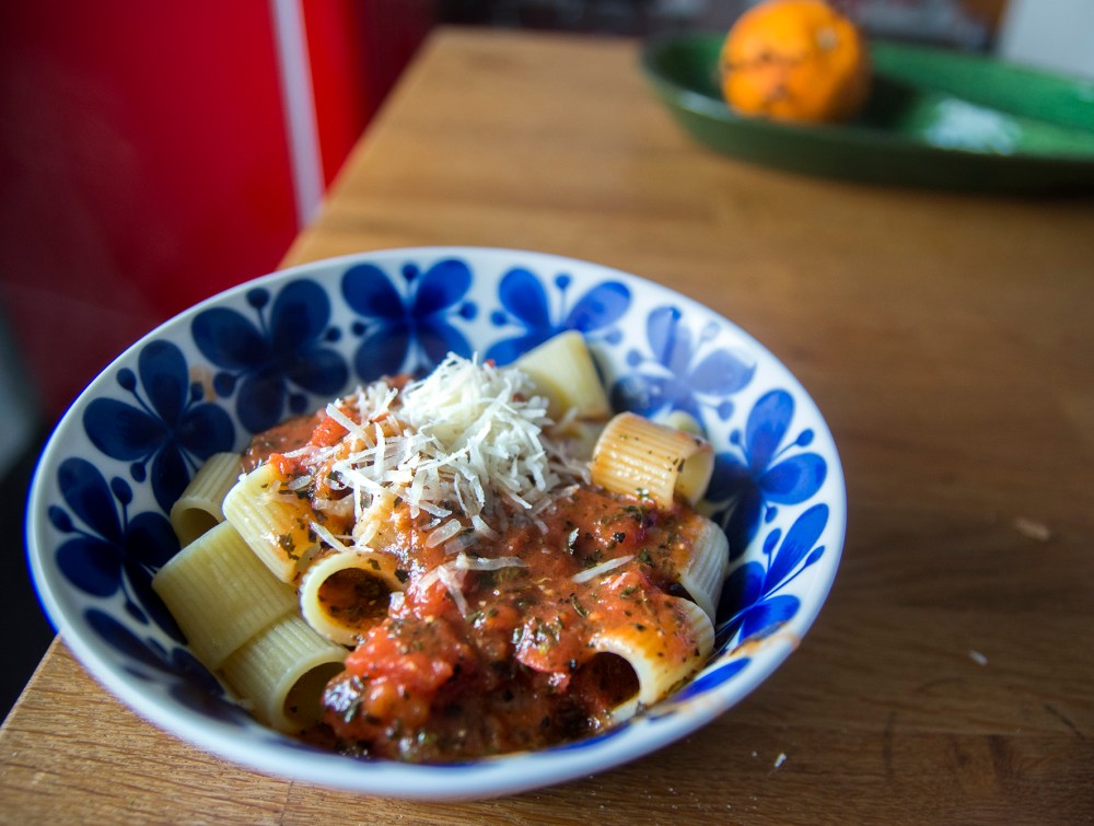 Koka upp de krossade tomaterna i en kastrull. Tillsätt torkade kryddor, salt och peppar. Låt koka lika länge som pastan. Tillsätt smöret och smaka av med salt och peppar.