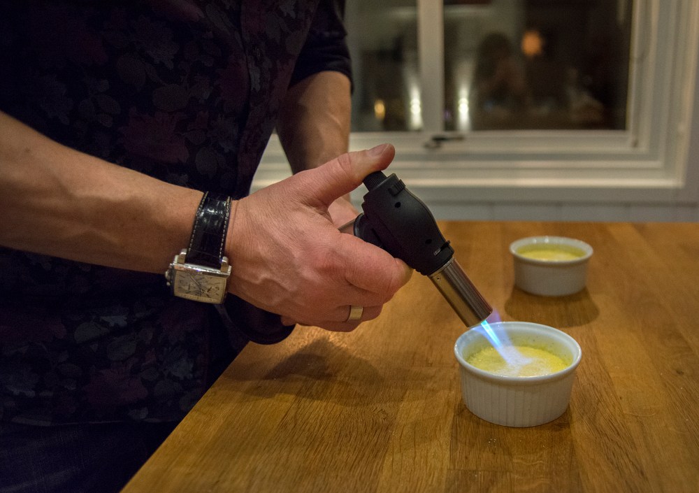 Låt formarna stå kallt tills precis innan det är dags att servera. Strö sedan ett tunt lager socker över ytan och smält med en gasolbrännare tills det blir fin färg.