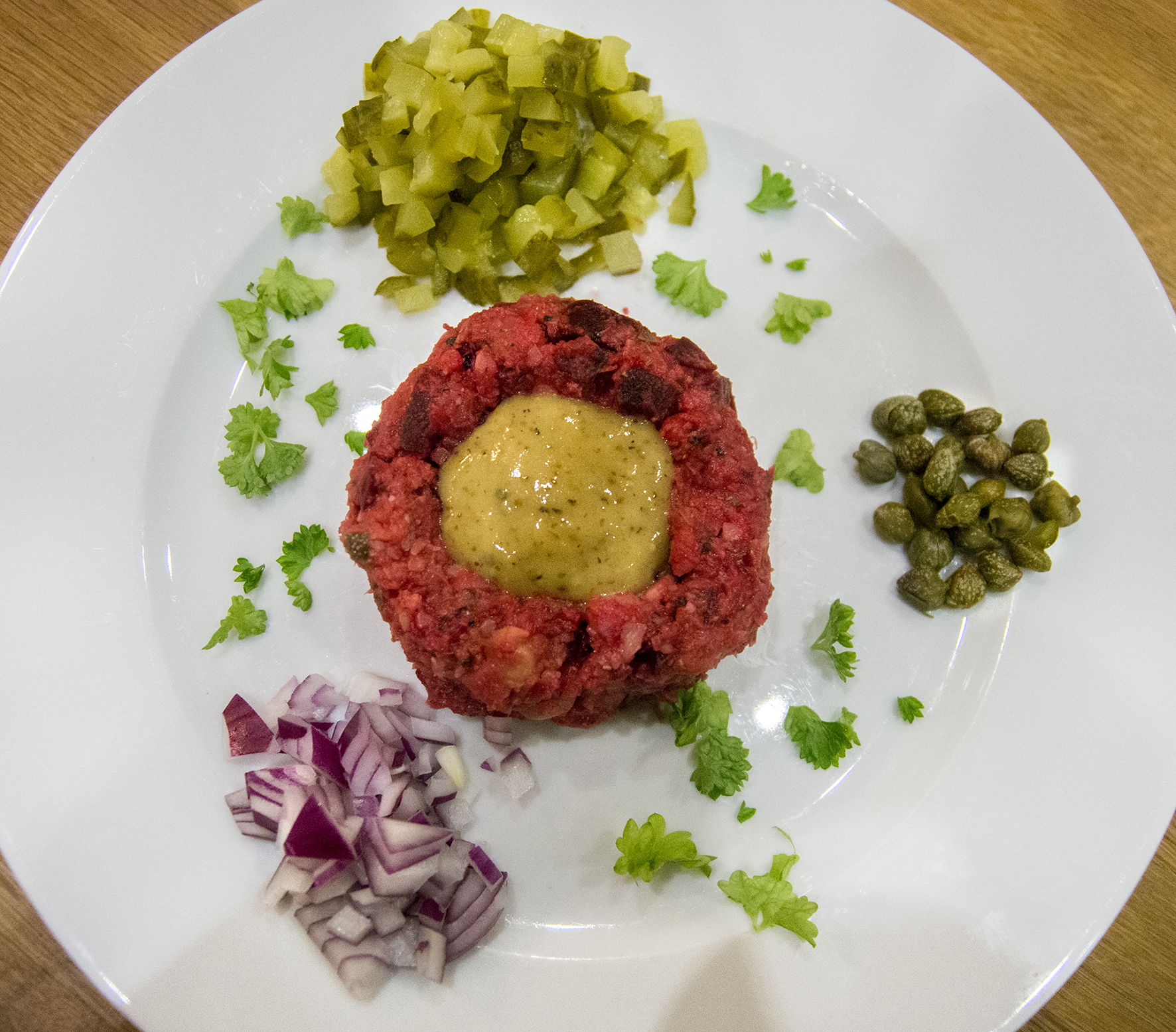 Ta fram rödbetsröran strax innan det är dags att äta. Forma biffar och lägg upp på tallrikarna. Gör en fördjupning i mitten och klicka ner senapssåsen. Lägg kapris, rödlök, persilja och saltgurka runt om.