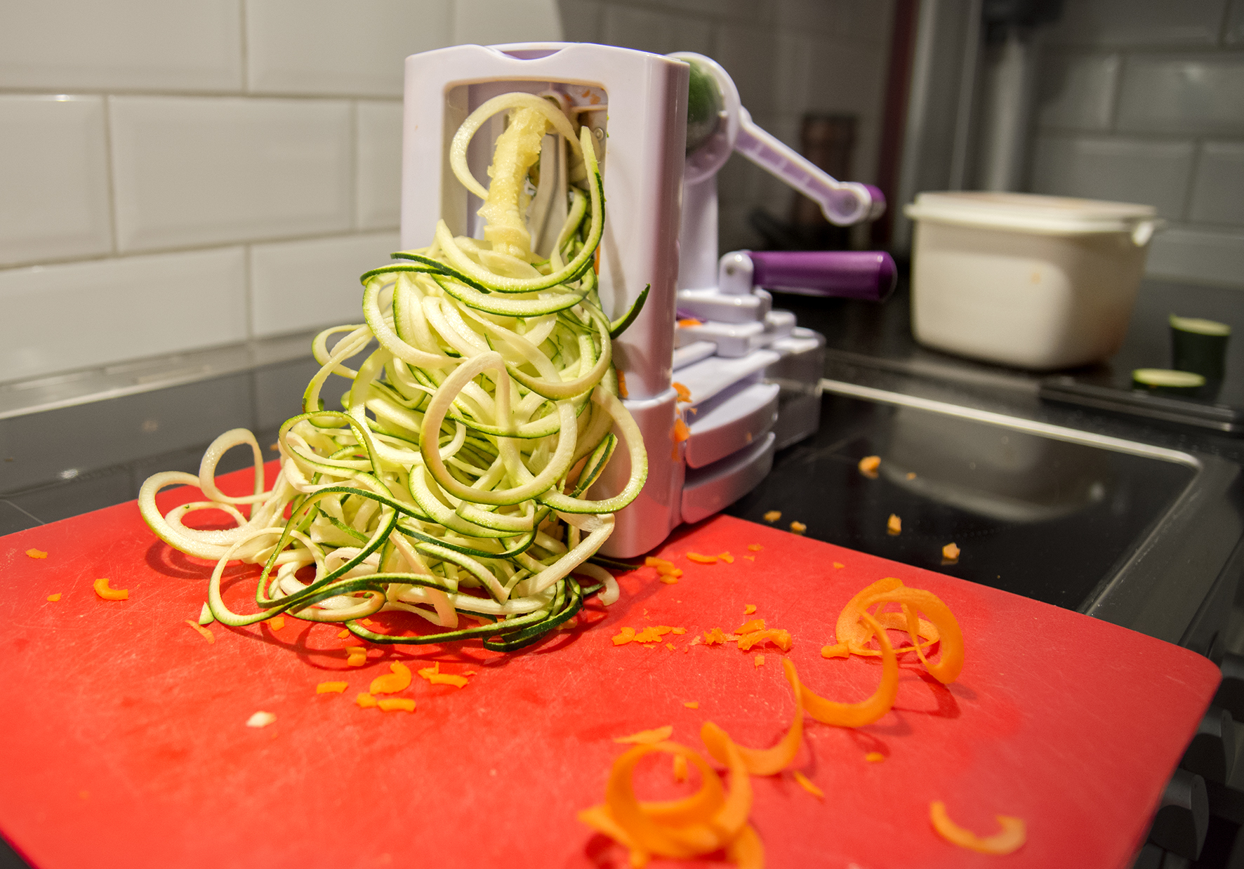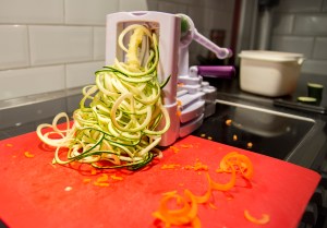 Svarva zucchini och morötter till spaghettisträngar.