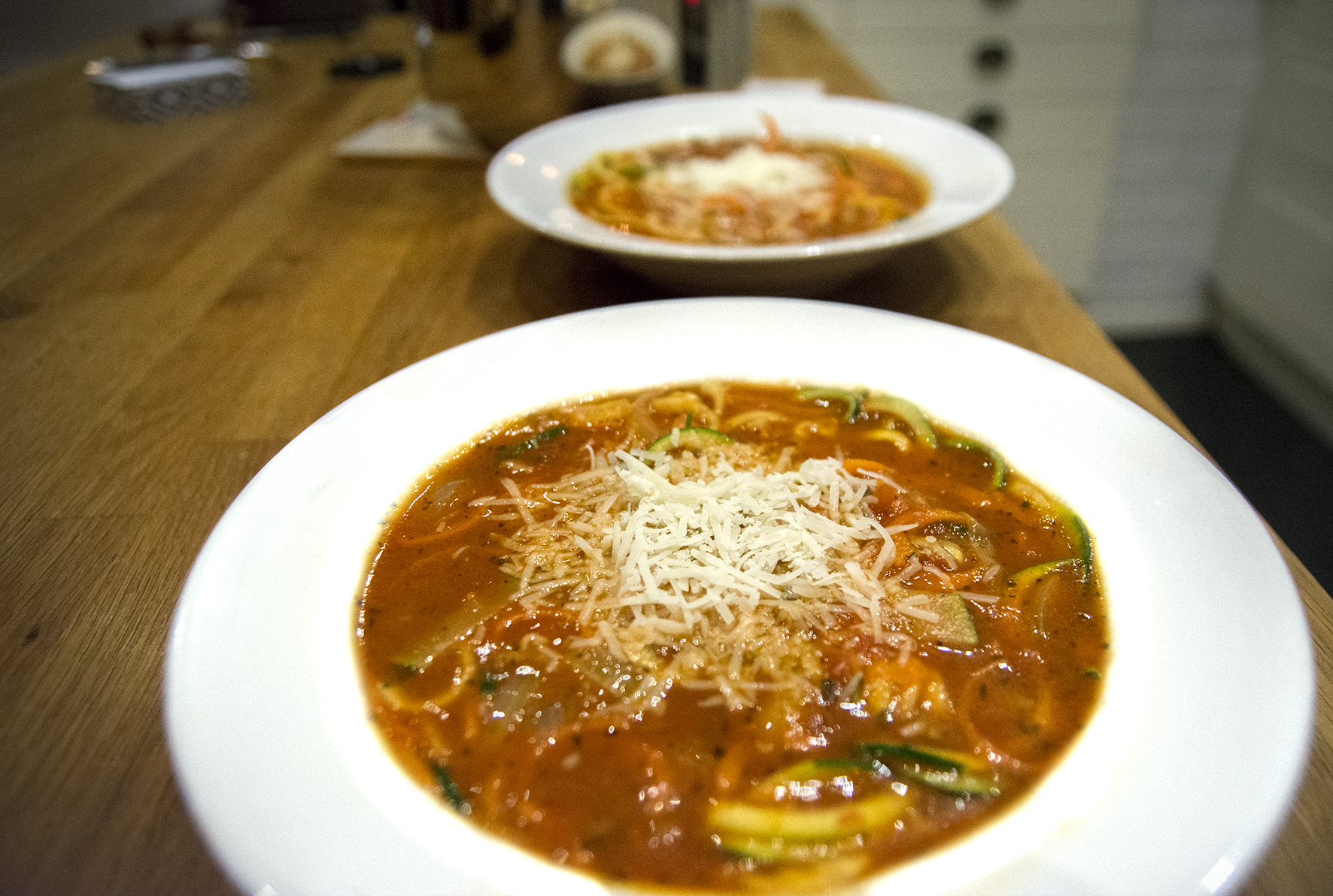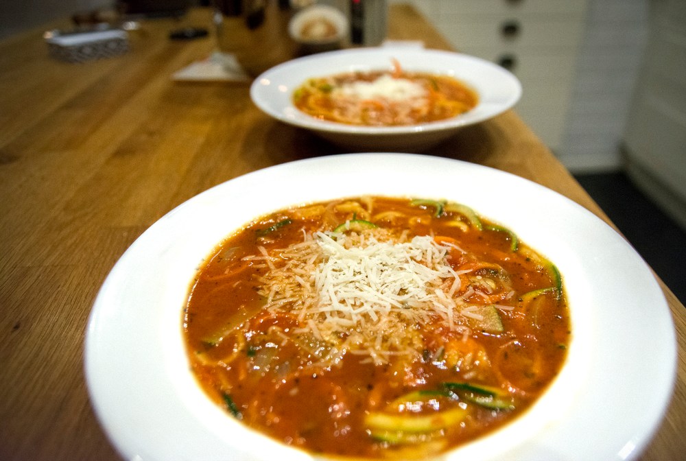 Nu gjorde jag en smakrik tomatsås med spaghettisträngar av zucchini och svarvade ned ett par morötter också. Det blev LCHF utan att jag hade planerat det. Gott!
