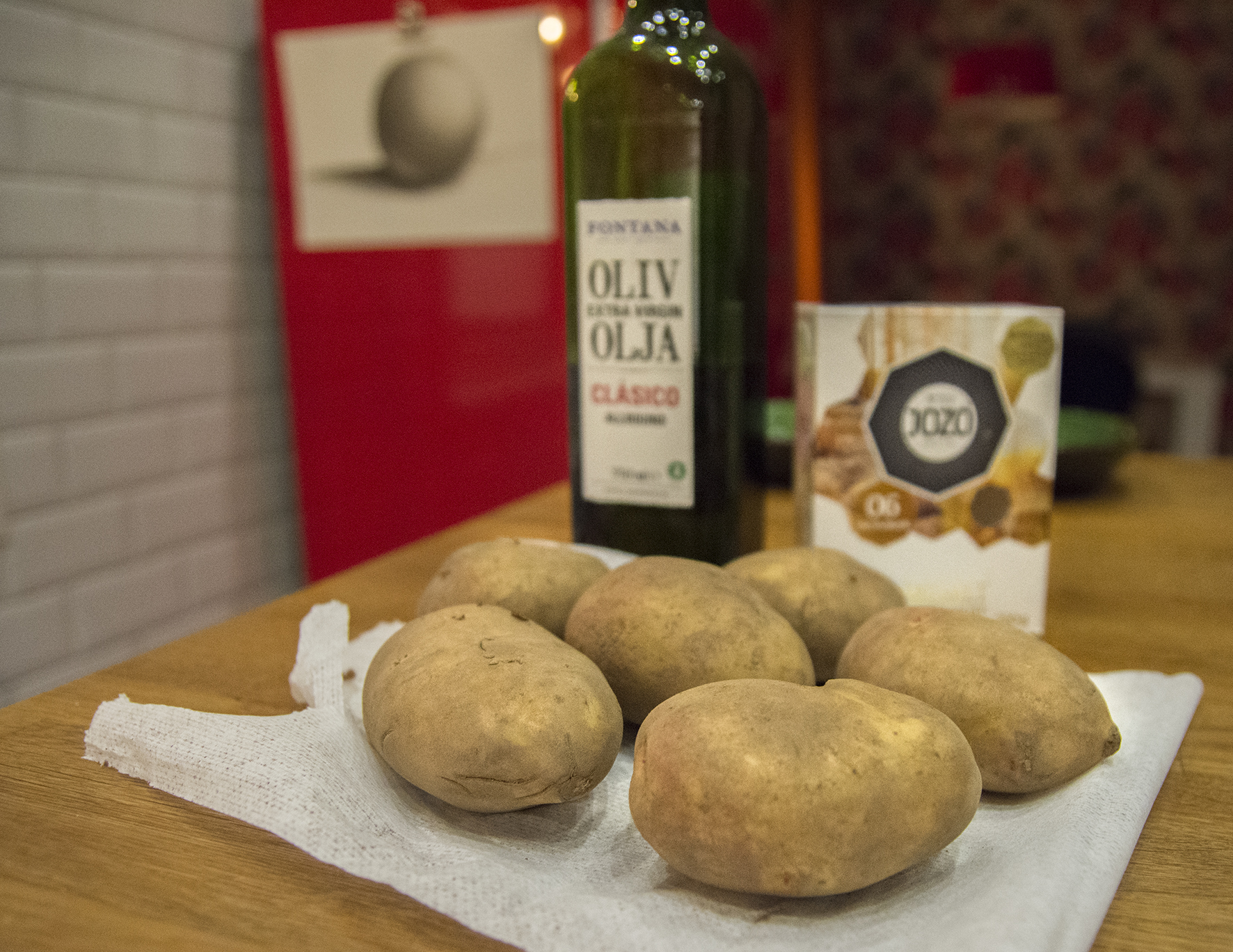 En timme innan servering: börja med klyftpotatisen. Värm ugnen till 225 grader. Borsta potatisarna men behåll skalet på. Klyfta dem och sprid ut på en bakplåtpappersklädd plåt. Pensla på generöst med olivolja och strö över flingsalt. Baka i ugnen i cirka 40 minuter – men ta ut plåten någon gång efter halva tiden och rör runt så alla klyftor gräddas jämnt. Låt stå tills de fått gyllene färg och är lite knapriga.