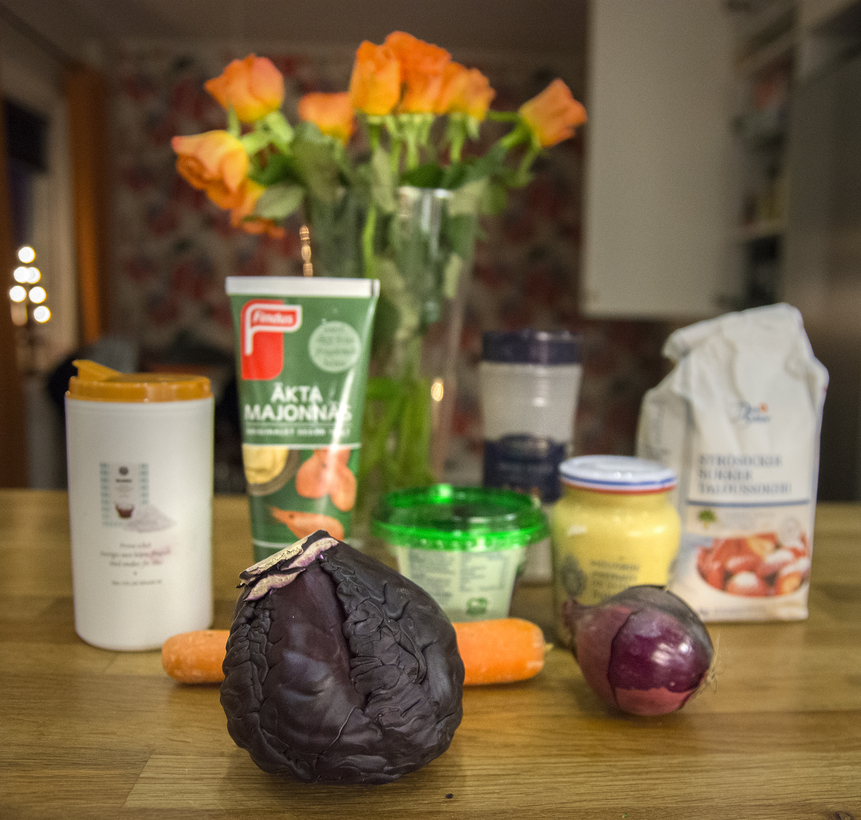 Skala och grovriv moroten. Skala och finhacka rödlöken. Torka av rödkålen med hushållspapper. Blanda ned grönsakerna i creme fraiche-röran och rör runt så att allt täcks. Täck över och ställ i kylskåp över natten, eller åtminstone i fyra-fem timmar.