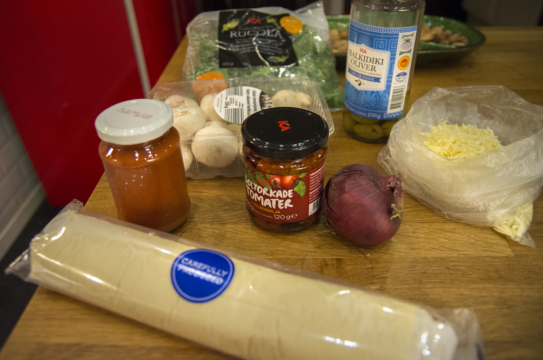 Jag inser att för en matblogg är detta kanske lite av ett lågvattenmärke, men … jag använde mig av ett färdigt pizzakit. Färsk deg, redo att rullas ut på plåten med papper och allt, och tomatsås. Då återstår ju bara det roliga, själva toppingen. Låt fantasin sätta gränserna, eller följ mitt recept slaviskt. Den blir garanterat god!