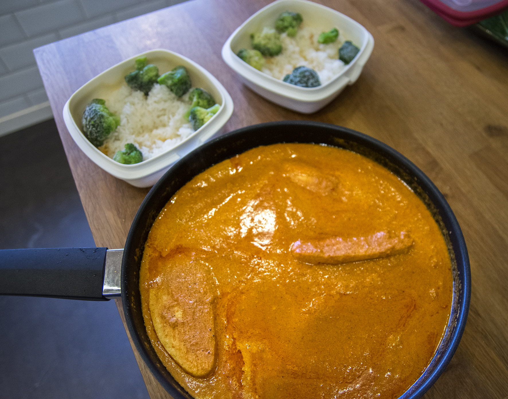 Kändes nästan som att häda när jag öste ner den färdiga rätten i matlådor från Ikea, för den borde avnjutas vid ett fint dukat bord med sitarmusik på lagom ljudnivå och ett gott sällskap. Men det får bli nästa gång!