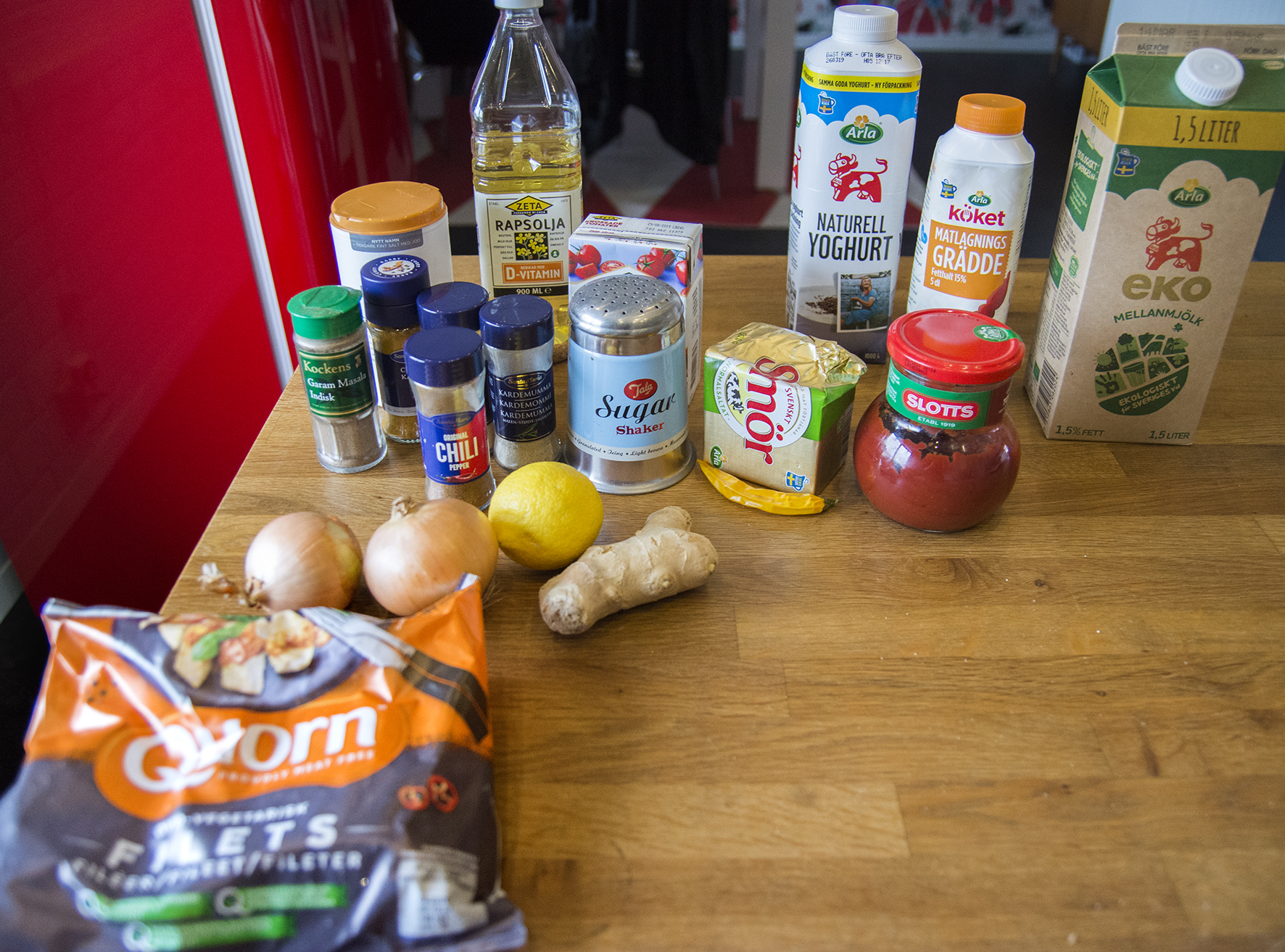 Häll i marinaden och quornfiléerna i såsen. Låt puttra i 20 minuter. Tillsätt lite mjölk om såsen är för tjock.