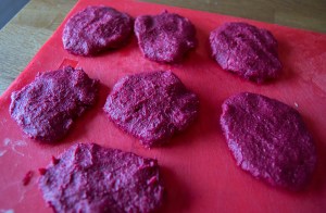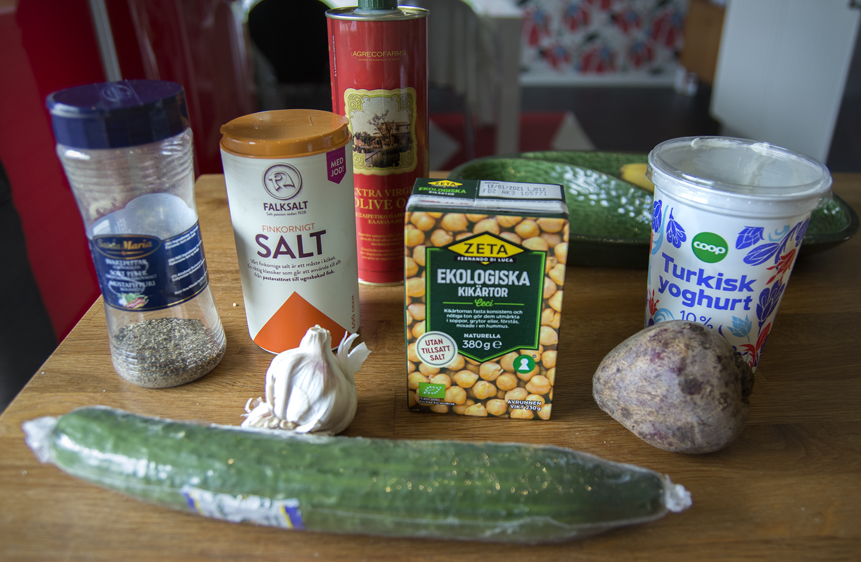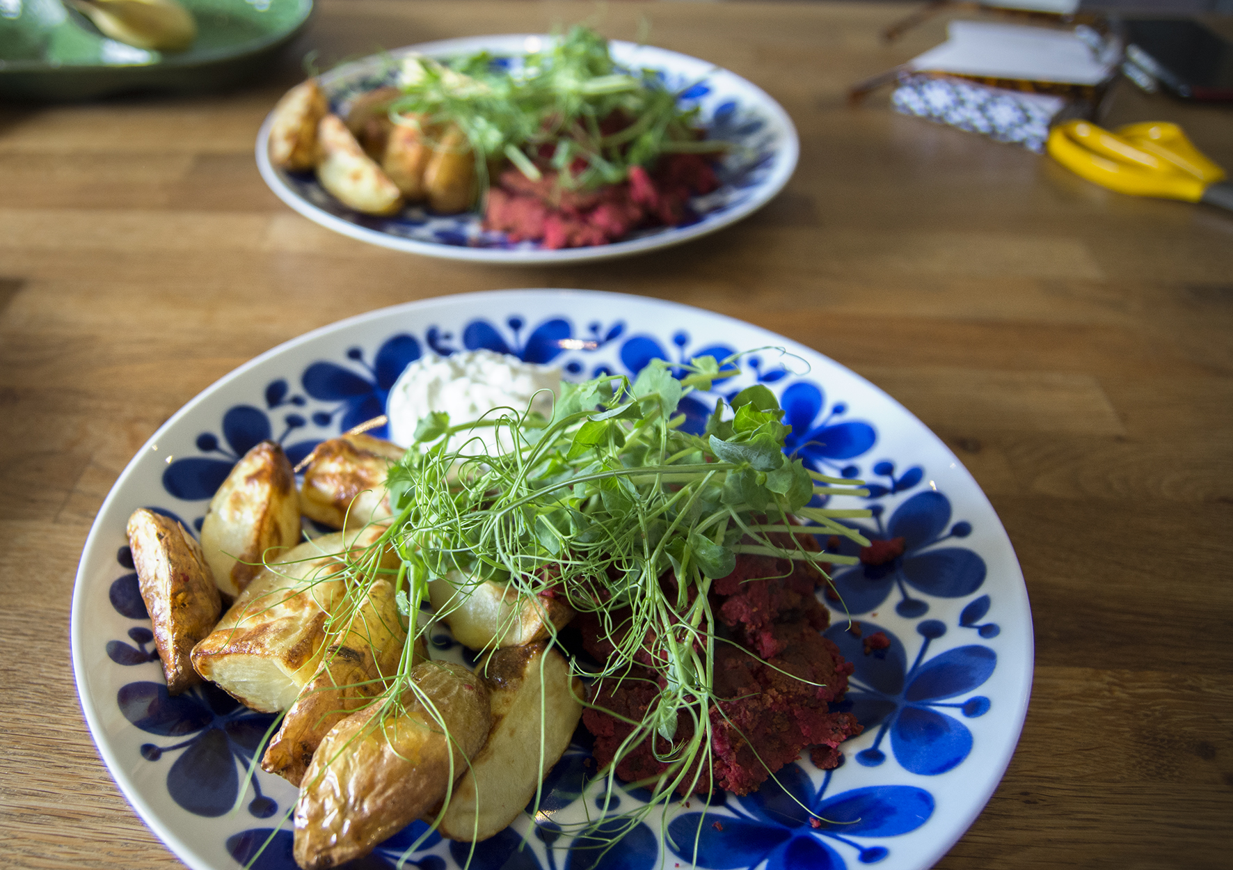 Jag vände mig till tidningen Vego igen och lät mig inspireras av härligt blodröda biffar med kikärtor och rödbeta med klyftpotatis och tzatziki till. Följde inte receptet särskilt slaviskt, men det blev gott ändå.